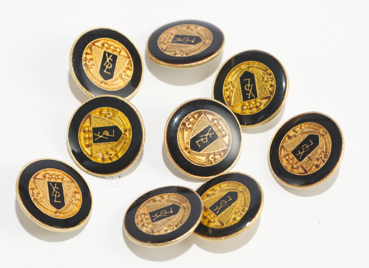 9 VINTAGE METAL BUTTONS BY YVES ST LAURENT, BUTTON DIAMETER 2.2CM, TOTAL WEIGHT 38.3GMS