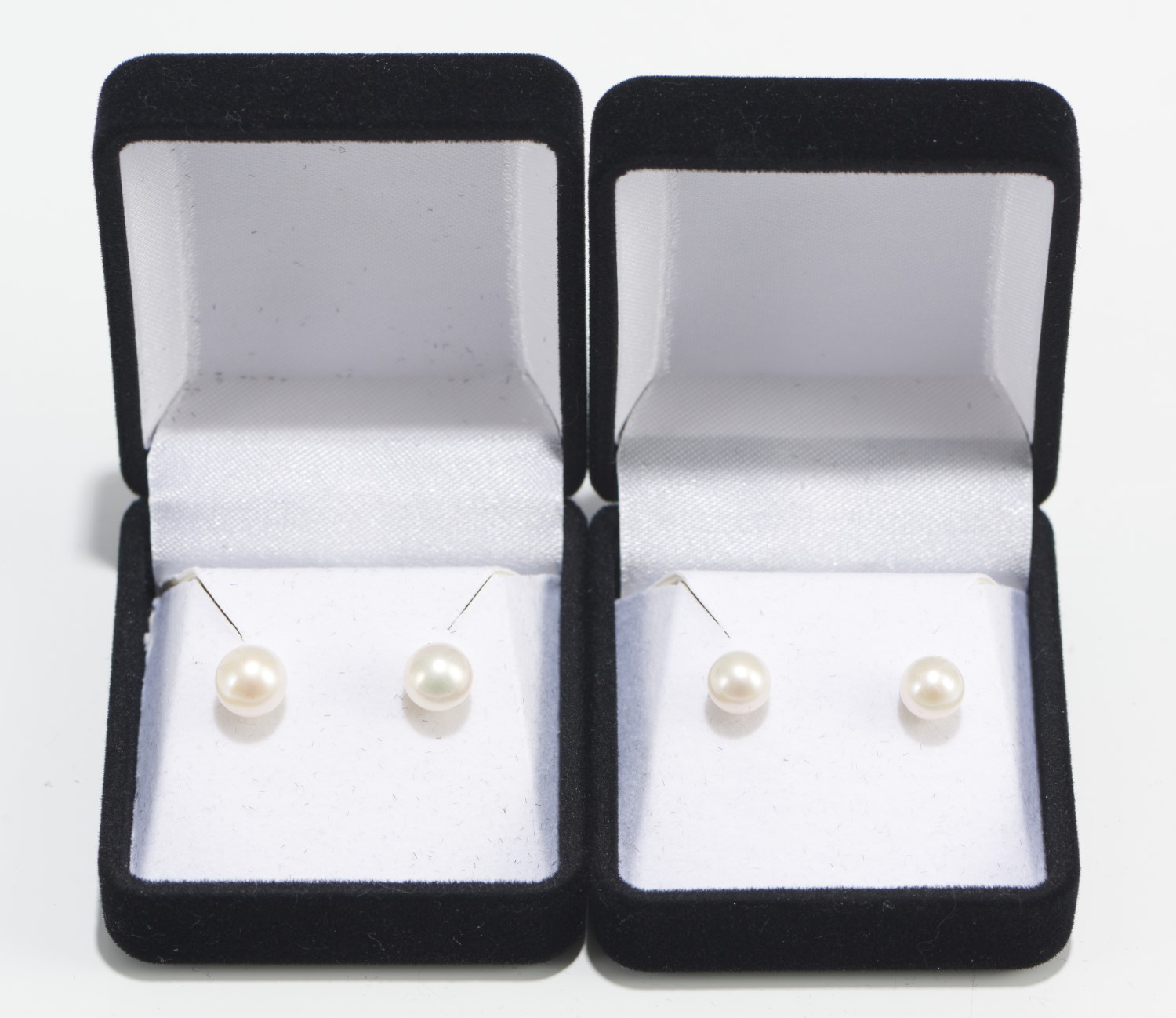 TWO PAIRS OF CULTURED PEARL STUDS TO STERLING SILVER STUD FITTINGS, PEARL DIAMETER 0.7CM AND 0.8CM, BOXED