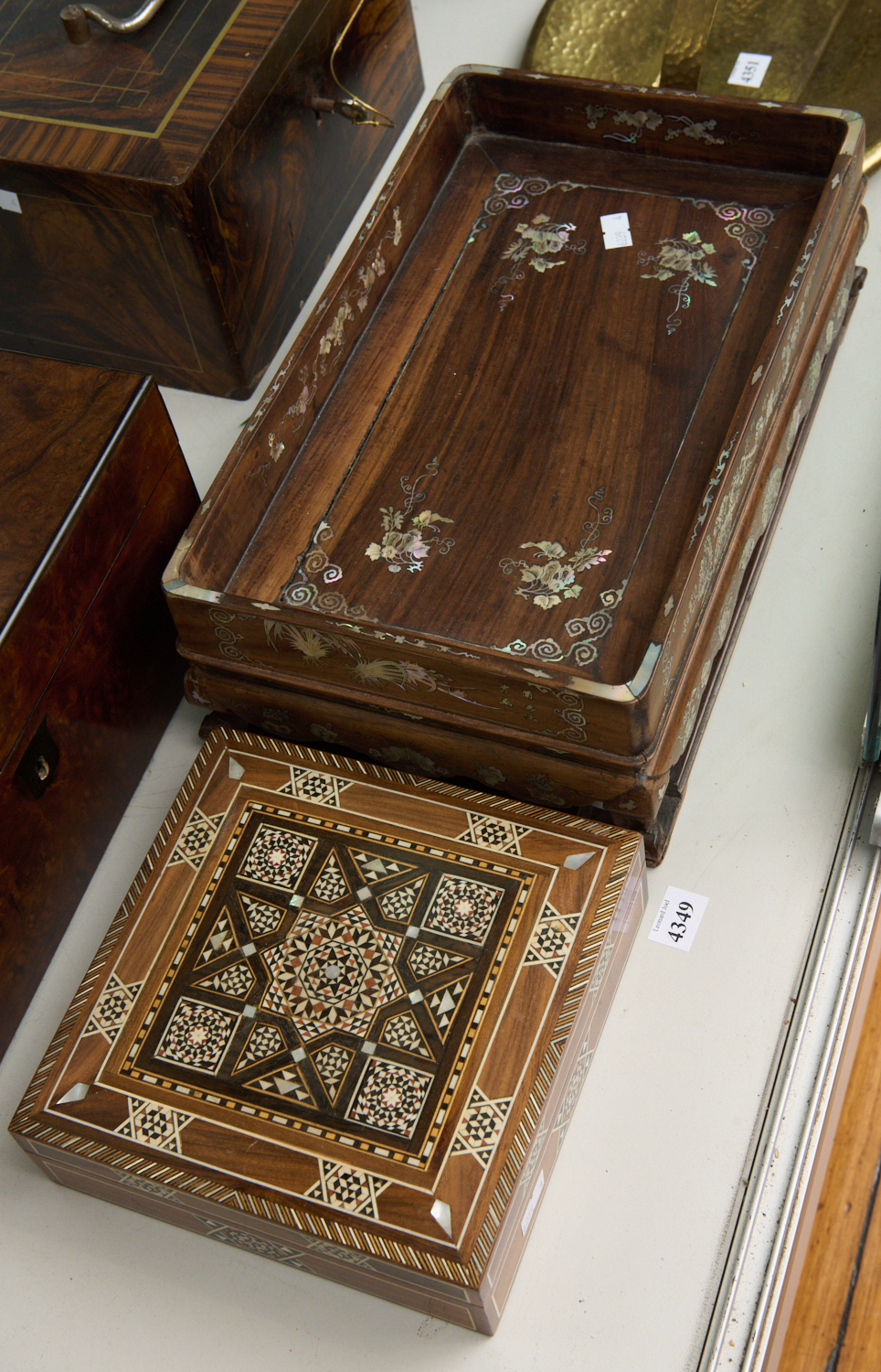 A VIETNAMESE MOTHER OF PEARL INLAID TRAY TOGETHER WITH BONE INLAY BOX, LEONARD JOEL LOCAL DELIVERY SIZE: SMALL