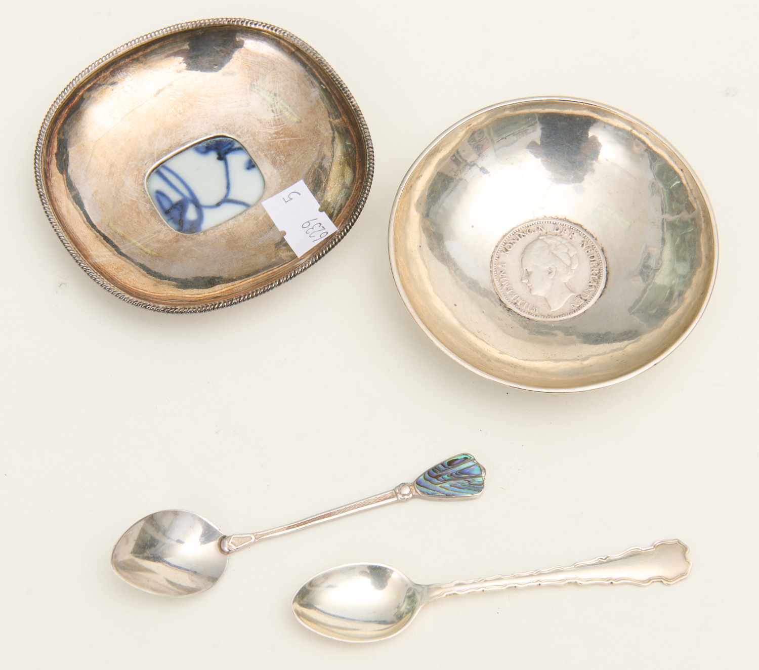 A GROUP OF SILVER (UNMARKED) INCLUDING DUTCH COIN INSET BOWL, LEONARD JOEL LOCAL DELIVERY SIZE: SMALL