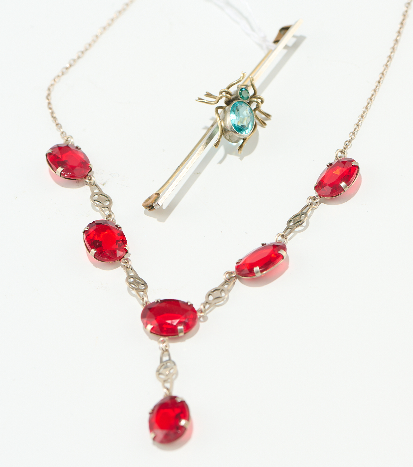A RED PASTE SILVER METAL SET NECKLACE AND BLUE PASTE SET SPIDER BAR BROOCH IN SILVER METAL, NECKLACE LENGTH 40CM, BROOCH LENGTH 5.8CM