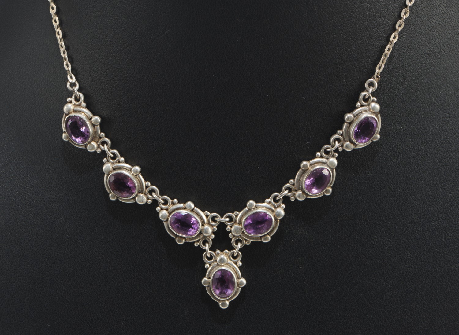 AN AMETHYST SET NECKLACE IN STERLING SILVER, LENGTH 43CM, WEIGHT 16.2GMS