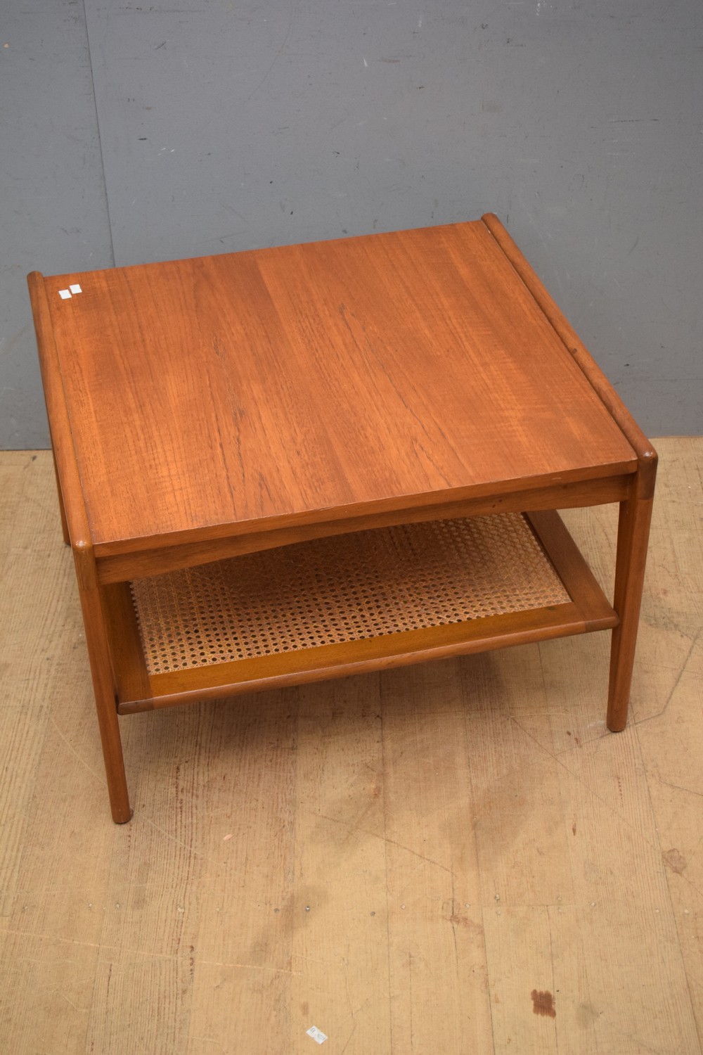 A SQUARE TEAK TWO TIER COFFEE TABLE WITH RATTAN BASE (H43 X W65 X D63 CM) (LEONARD JOEL DELIVERY SIZE: LARGE)