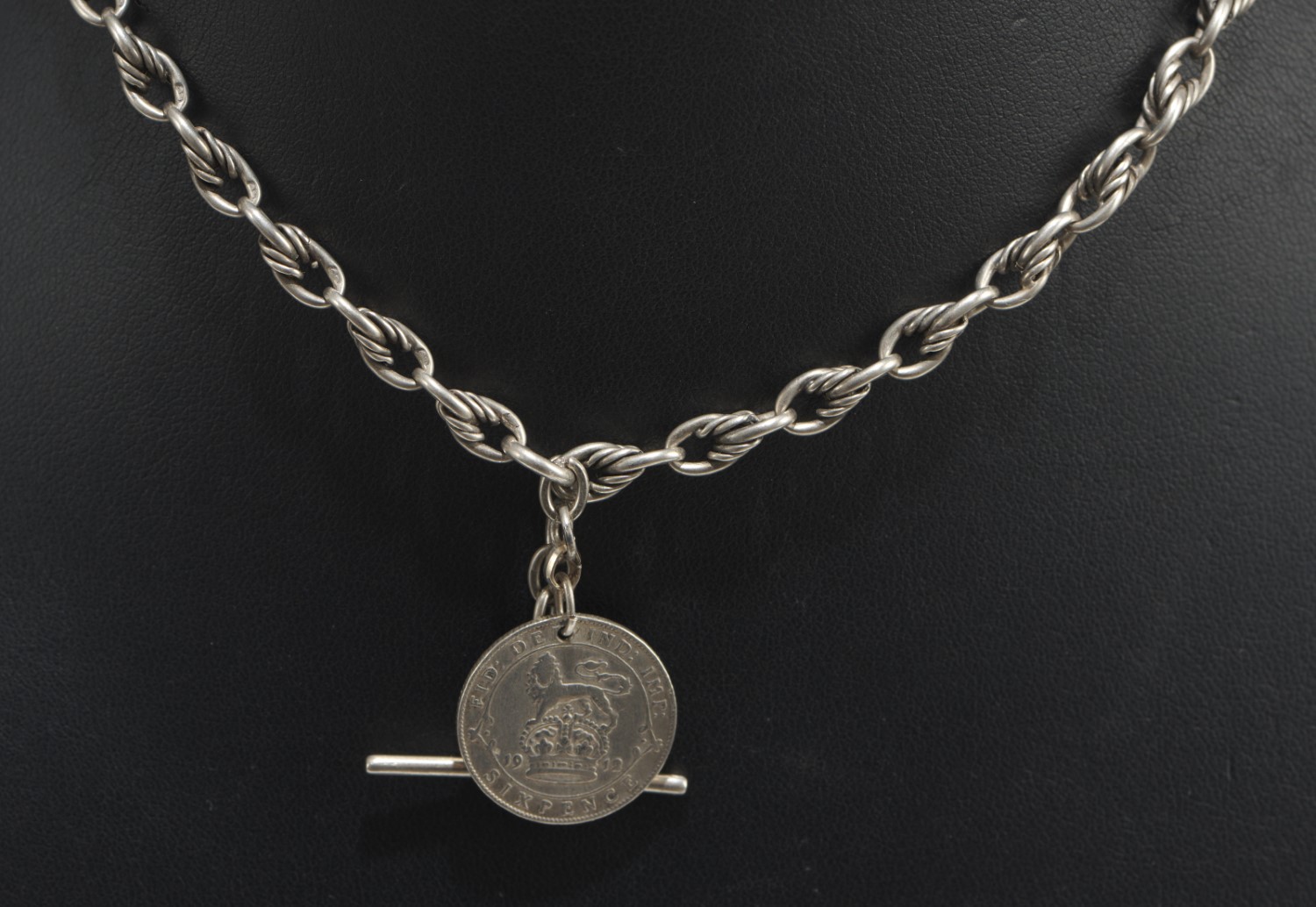 A FANCY LINK H.p. MARKED SILVER WATCH CHAIN WITH COIN AND FOB MARKED STERLING SILVER, LENGTH 36CM, WEIGHT 24GMS
