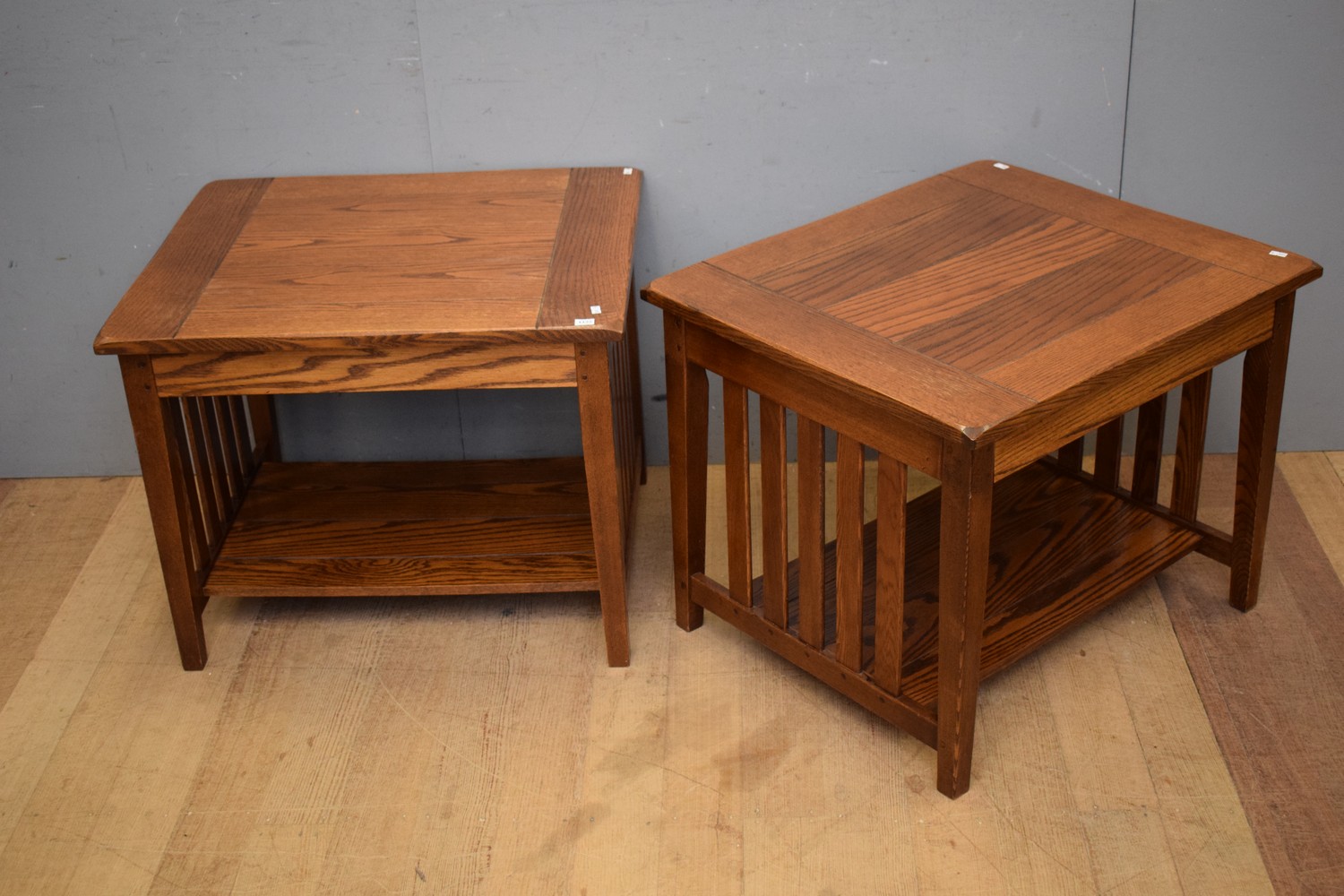 A PAIR OF ARTS AND CRAFTS STYLE AMERICAN OAK LAMP TABLES (55H x 71W x 61D CM) (LEONARD JOEL DELIVERY SIZE: LARGE)