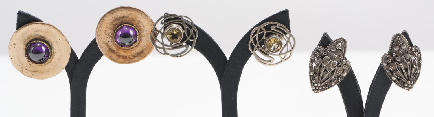 THREE PAIRS OF VINTAGE EARRINGS INCLUDING A PAIR WITH FILIGREE DESIGN STAMPED 900 SILVER, A CITRINE SET STERLING SILVER PAIR AND A AMETHYST SET COPPER PAIR BY JAN MICHAELS
