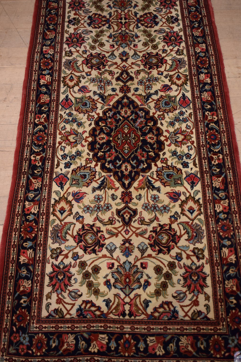 AN IRANIAN QUM WOOL RUNNER (A/F) (439 X 80 CM) (LEONARD JOEL DELIVERY SIZE: LARGE)