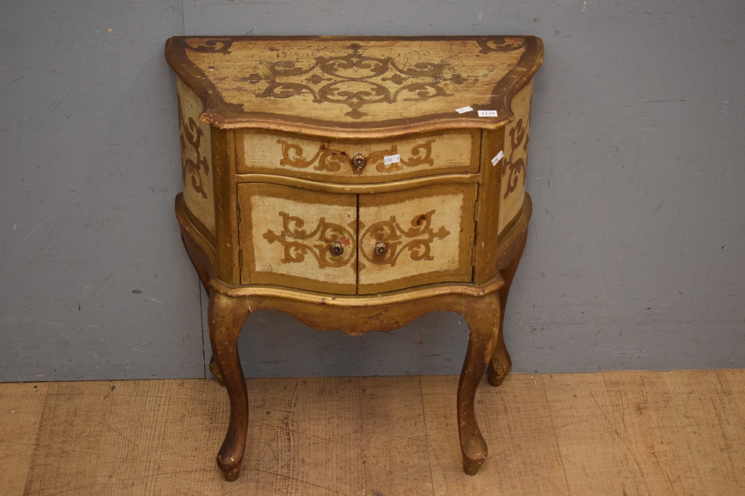 AN EARLY 20TH CENTURY ITALIAN GILTWOOD FLORENTINE SINGLE DRAWER AND 2 DOOR CHEST OF DRAWERS WITH CREAM DETAILING AND BRASS HANDLES (A/F) (65H x 57W x 32D CM) (LEONARD JOEL DELIVERY SIZE: MEDIUM)