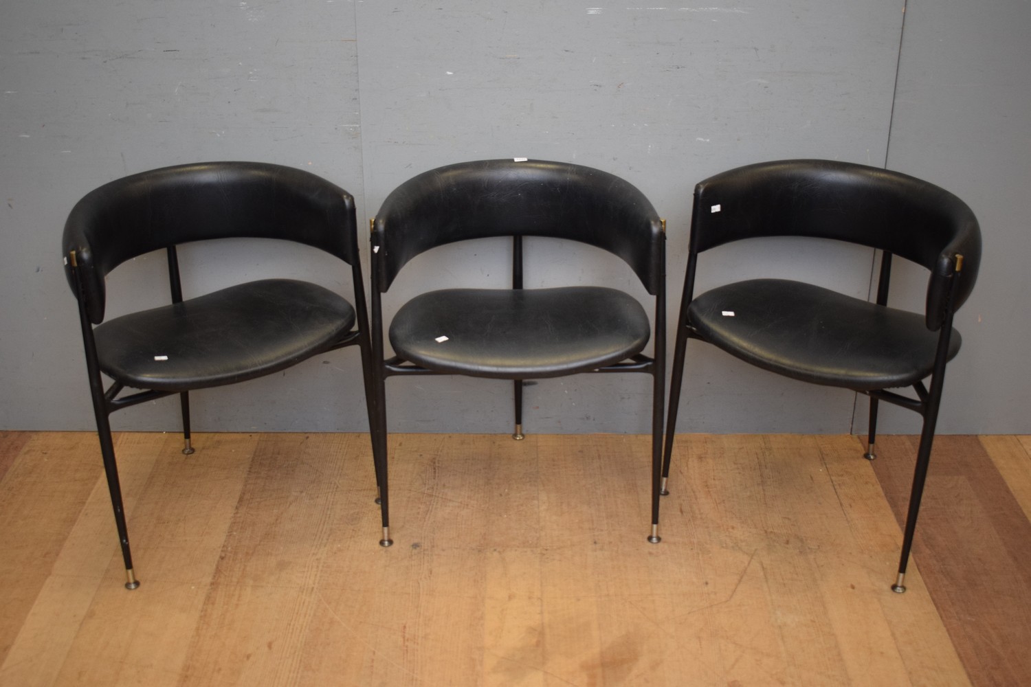 THREE 1960S ARISTOC BLACK VINYL 3 LEGGED METAL BASED ARM CHAIRS (60H x 55W x 43D CM) (LEONARD JOEL DELIVERY SIZE: LARGE)