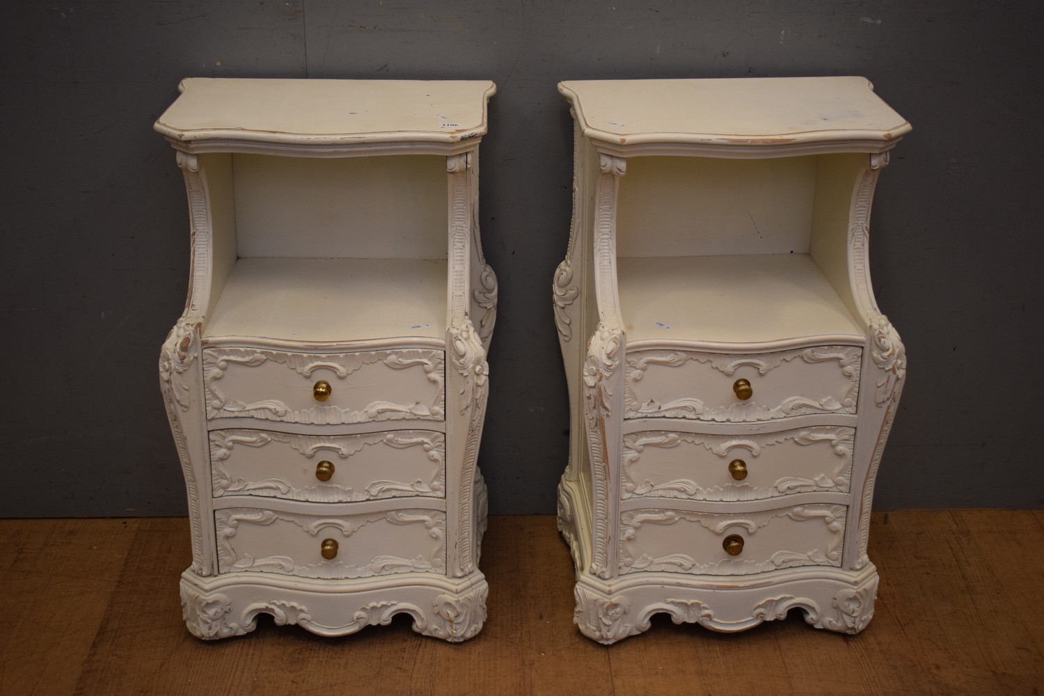 PAIR OF FRENCH PROVINCIAL STYLE SOLID WOODEN PAINTED WHITE 3 DRAWER BEDSIDE CABINETS (65H x 40W x 28D CM) (LEONARD JOEL DELIVERY SIZE: LARGE)