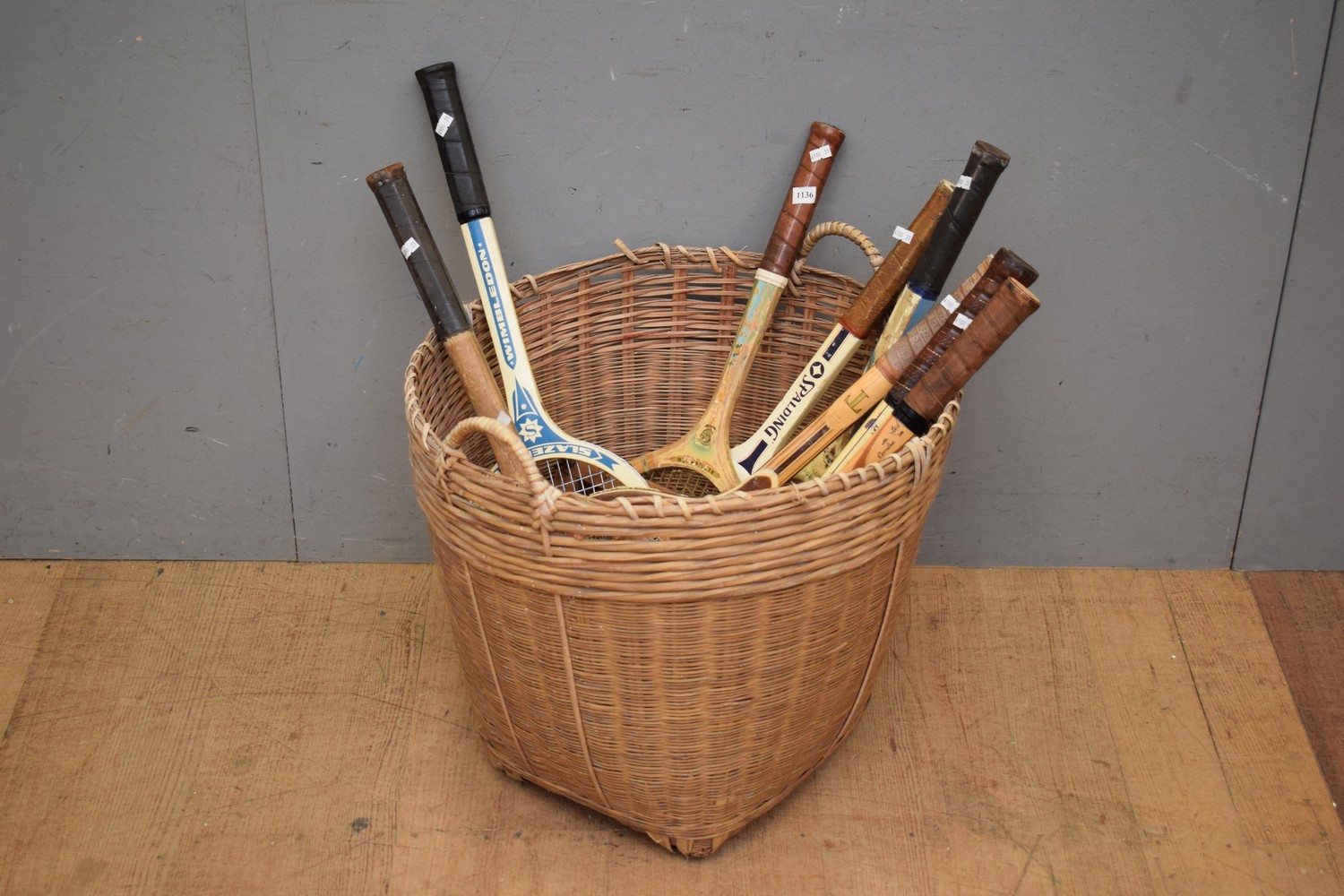 COLLECTION OF 8 VINTAGE WOODEN TENNIS RACQUETS IN CANE BASKET (LEONARD JOEL DELIVERY SIZE: LARGE)