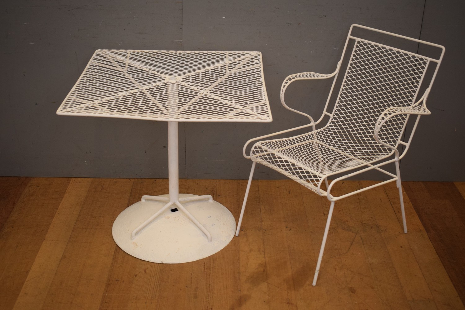 A FRENCH PAINTED WHITE METAL AND MESH PEDESTAL OUTDOOR TABLE AND MATCHING CHAIR (72H x 75W x 76D CM) (LEONARD JOEL DELIVERY SIZE: LARGE)