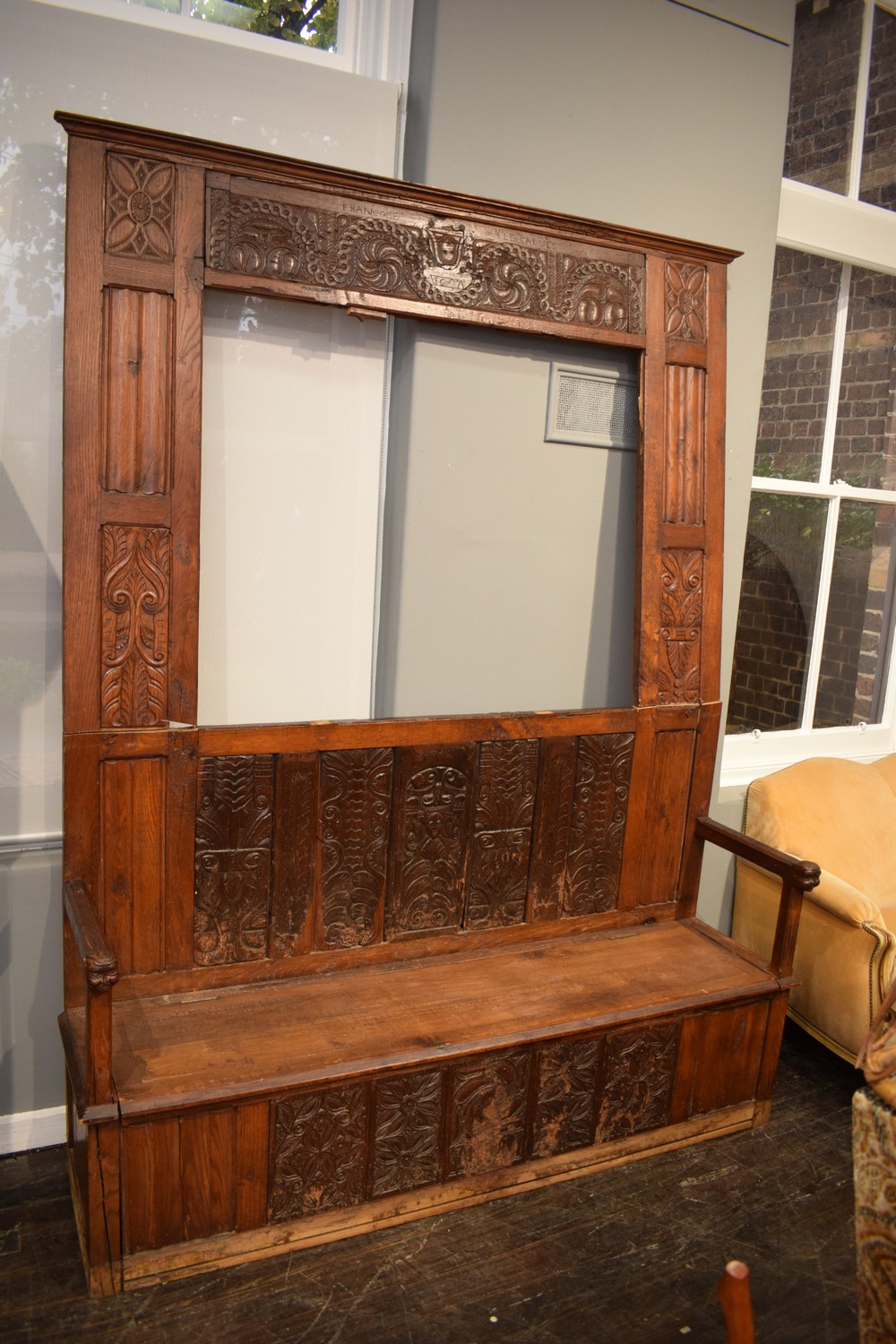 18TH CENTURY FRENCH OAK SETTLE AF, C.1770'S (A/F) (H243 X W194 X D52 CM) (PLEASE NOTE THIS HEAVY ITEM MUST BE REMOVED BY CARRIERS AT THE CUSTOMER'S EXPENSE. LEONARD JOEL STAFF CANNOT ASSIST CARRYING THIS ITEM) (X-LARGE ITEM)