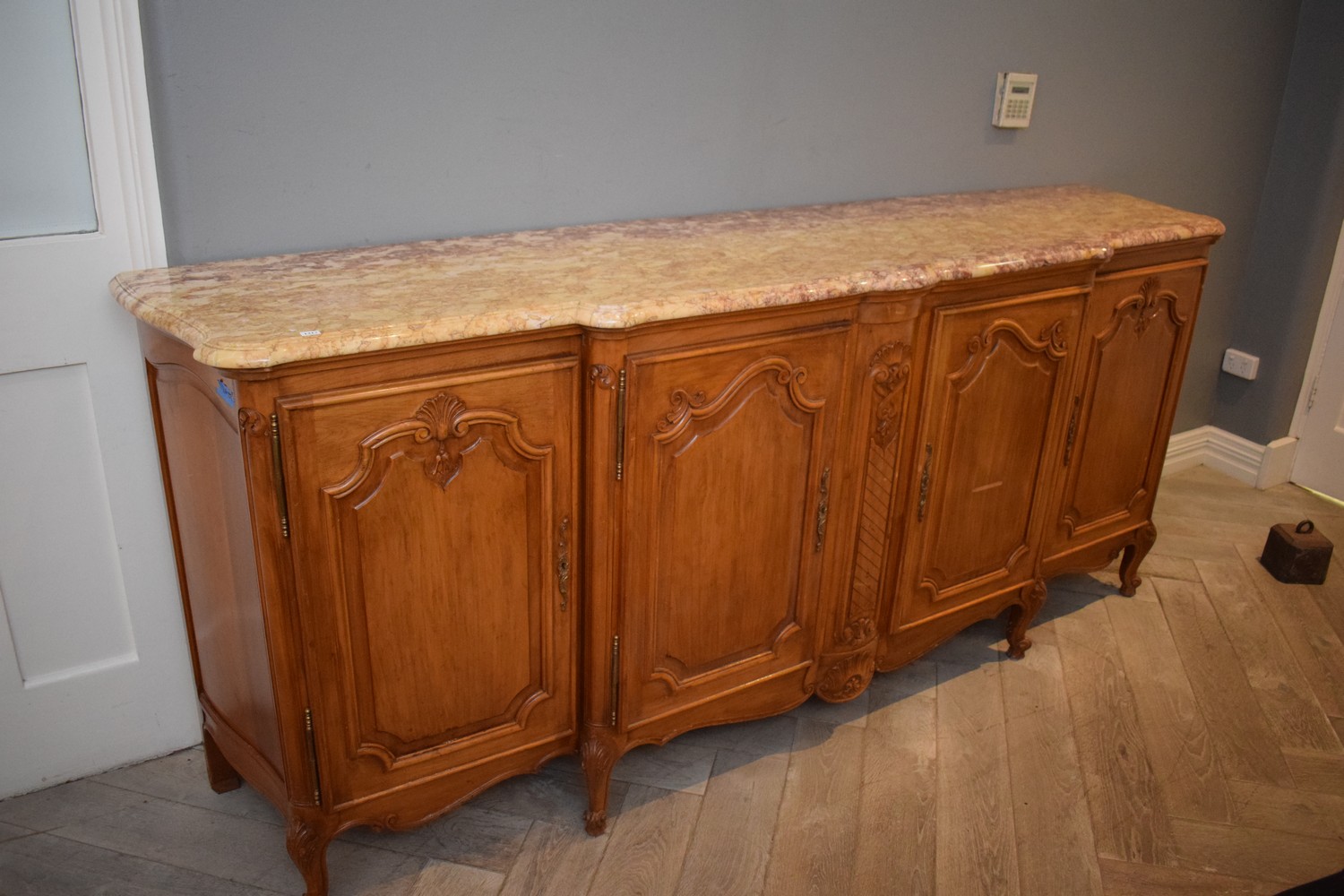 FRENCH LOUIS XV CHERRYWOOD & MARBLE 4 DOOR BUFFET, C.1930'S (A/F) (H103 x W243 x D60 CM) (PLEASE NOTE THIS HEAVY ITEM MUST BE REMOVED BY CARRIERS AT THE CUSTOMER'S EXPENSE. LEONARD JOEL STAFF CANNOT ASSIST CARRYING THIS ITEM) (X-LARGE ITEM)