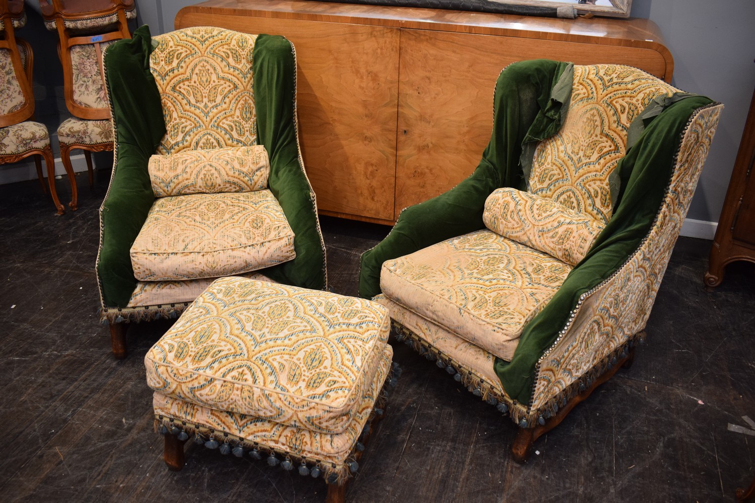 PAIR OF 19TH CENTURY FRENCH LOUIS XIV MOUTON BERGERES & OTTOMAN, C. 1880'S (A/F) (H104 X W82 X D100 CM) (PLEASE NOTE THIS HEAVY ITEM MUST BE REMOVED BY CARRIERS AT THE CUSTOMER'S EXPENSE. LEONARD JOEL STAFF CANNOT ASSIST CARRYING THIS ITEM) (X-LARGE ITEM)