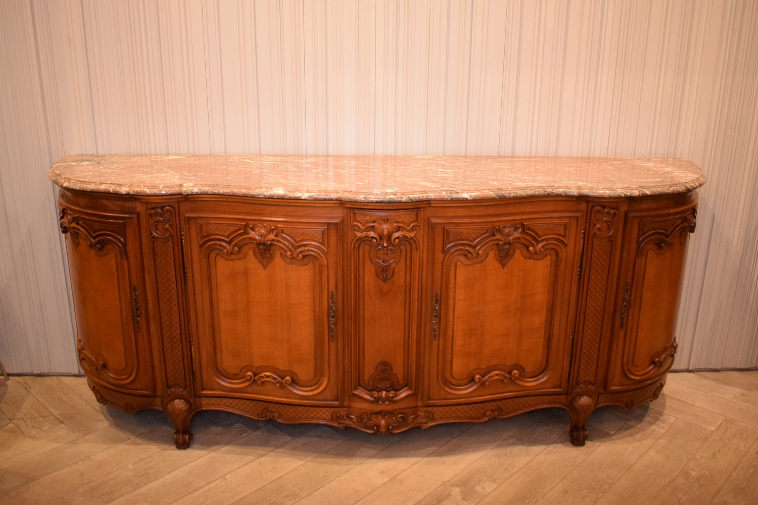 FRENCH LOUIS XV CHERRYWOOD & MARBLE TOP BUFFET, C.1930'S (105H x 259W x 66D CM) (PLEASE NOTE THIS HEAVY ITEM MUST BE REMOVED BY CARRIERS AT THE CUSTOMER'S EXPENSE. LEONARD JOEL STAFF CANNOT ASSIST CARRYING THIS ITEM) (X-LARGE ITEM)