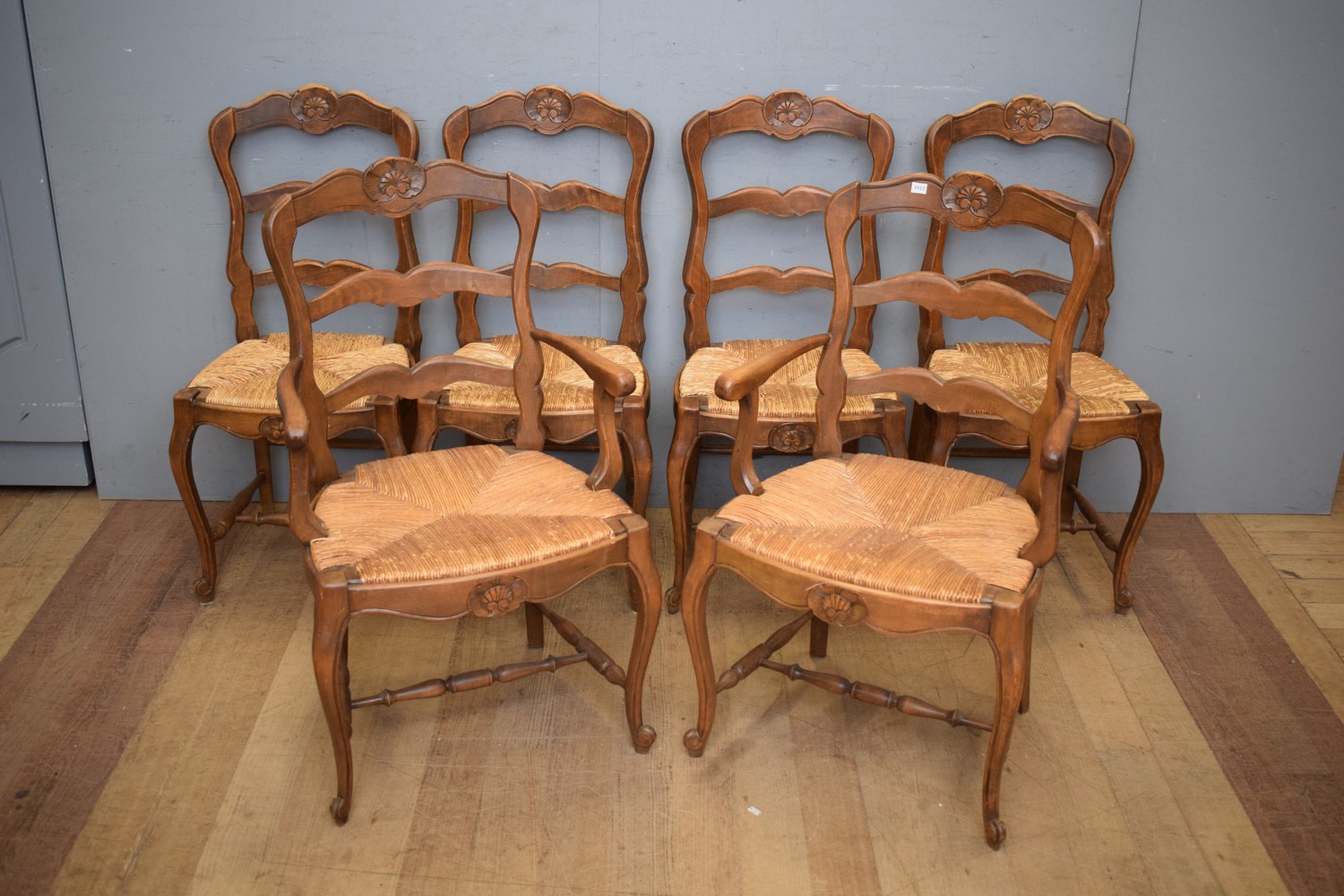 SET OF 6 FRENCH LOUIS XV RUSH SEATED CHERRYWOOD DINING CHAIRS INCLUDING 2 CARVERS, C.1930'S (97H x 60W x 53D CM) (LEONARD JOEL DELIVERY SIZE: LARGE)