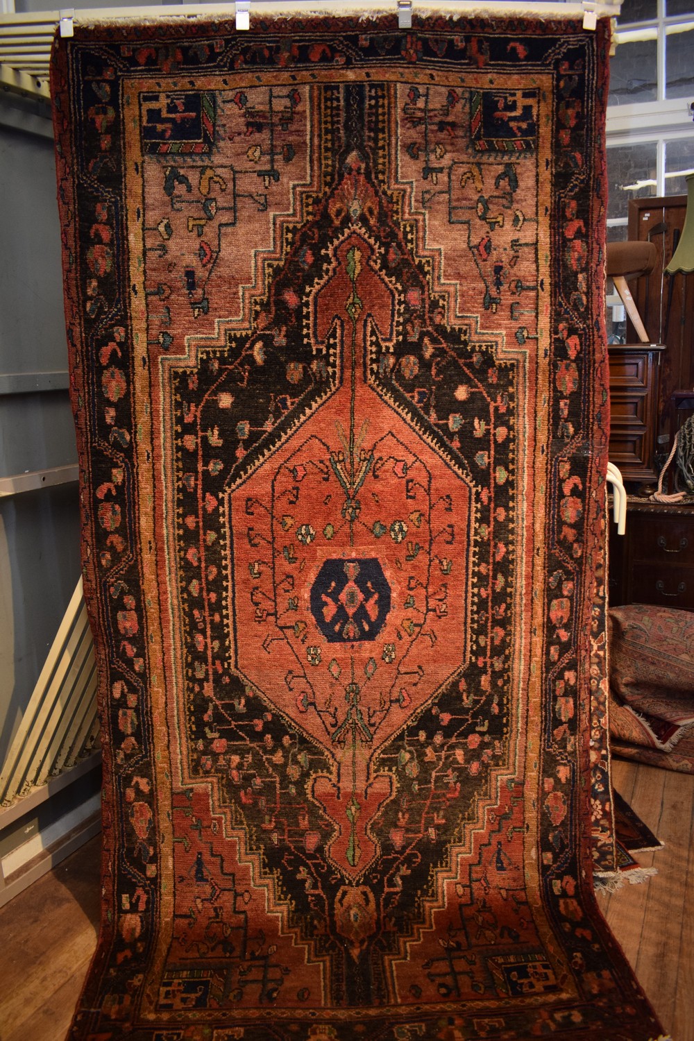 A TRIBAL PERSIAN TOYSERKAN RUG. 100% WOOL, NATURAL DYE. HAND-KNOTTED VILLAGE WEAVE WITH TRIBAL DESIGN OF BOLD HEXAGONAL ANCHORED MEDALLION & CORNER MEDALLIONS IN A CHARCOAL & SOFT RED TONED FIELD OF GEOMETRIC PATTERNS & LEAF FORMS. BORDER OF ROSETTES & TENDRILS. CERTIFICATE OF AUTHENTICITY INCLUDED. SIZE: 302X150CM ORIGIN: PERSIA - RRP: $1,900