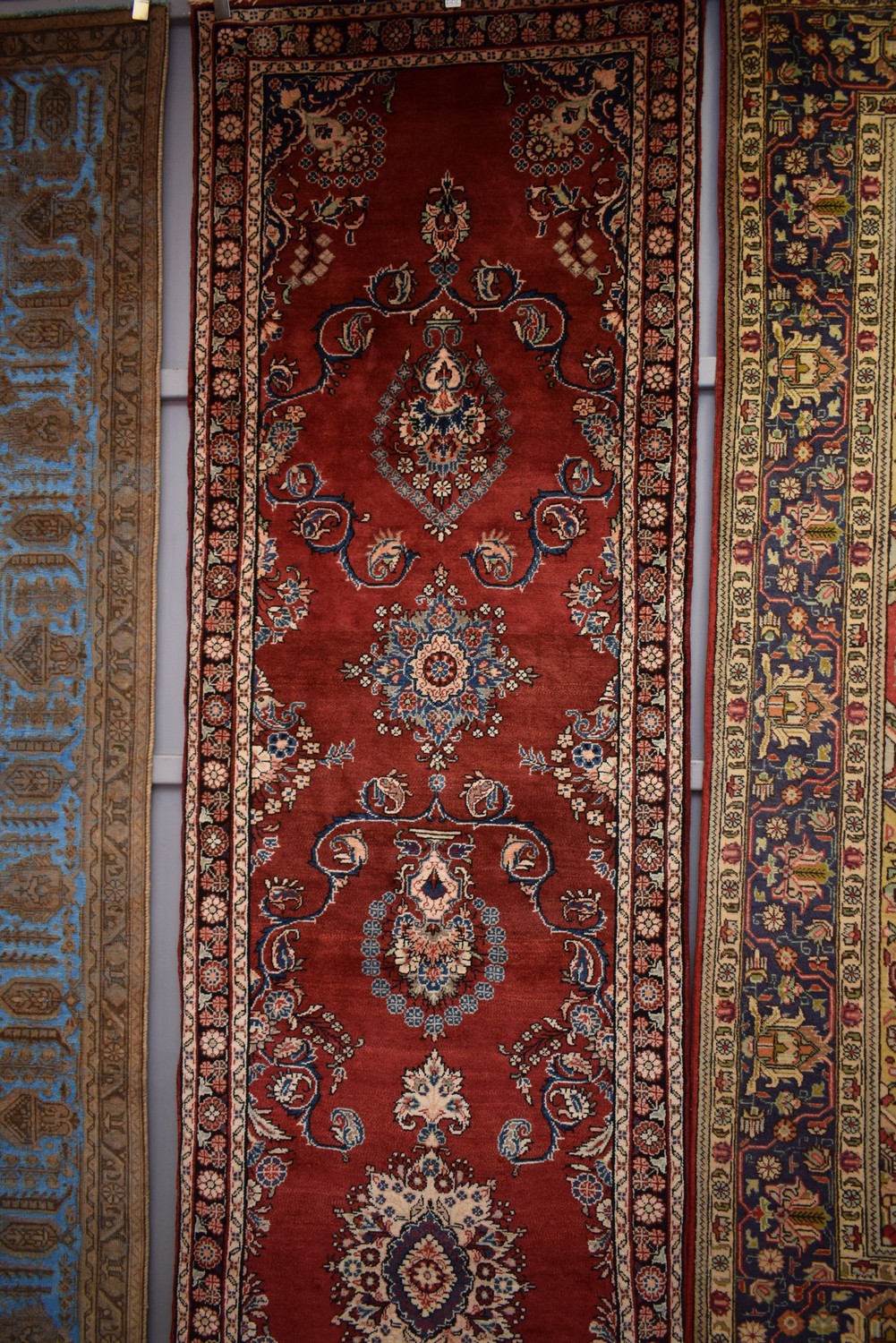 A GORGEOUS FINE PERSIAN MEHRABAN HALL RUNNER- EXTRA LONG, 100% WOOL. DENSE PLUSH PILE. STURDY & HARD-WEARING. FINELY HAND-KNOTTED WEAVE WITH A DESIGN OF CENTRAL FLORAL MEDALLION & CONTINUING VASES BARING FLORAL SPRAYS, IN A RICH ROYAL RED FIELD OF FLORAL SPRAYS & SCROLLS. FLORAL-PATTERNED BORDER. IN EXCELLENT CONDITION. EX GALLERY. CERTIFICATE OF AUTHENTICITY INCLUDED. SIZE: 505X100CM ORIGIN: PERSIA - RRP: $4,900
