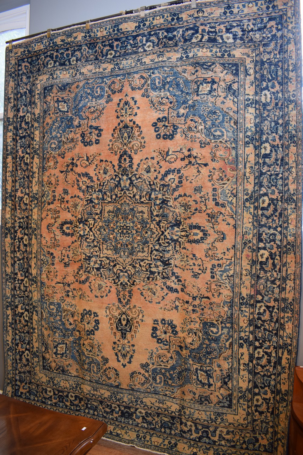 A SPECTACULAR MODERN OVER-DYED VINTAGE PERSIAN TABRIZ CARPET. EX-GALLERY STOCK. CREATED FROM AN ORIGINAL HAND-KNOTTED MEDALLION DESIGN PERSIAN TABRIZ CARPET, KNOTTED USING HAND SPUN WOOL ON STRONG COTTON WARPS WITH THE PILE SHORN DOWN. THE RUG IS OVER-DYED IN FRENCH BLUE & PEACH TONES. CERTIFICATE OF AUTHENTICITY INCLUDED. SIZE: 320X236CM ORIGIN: PERSIA - RRP: $7,200