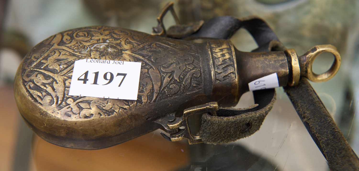 A VINTAGE BRASS GUN POWDER FLASK (13 CM H), LEONARD JOEL LOCAL DELIVERY SIZE: SMALL