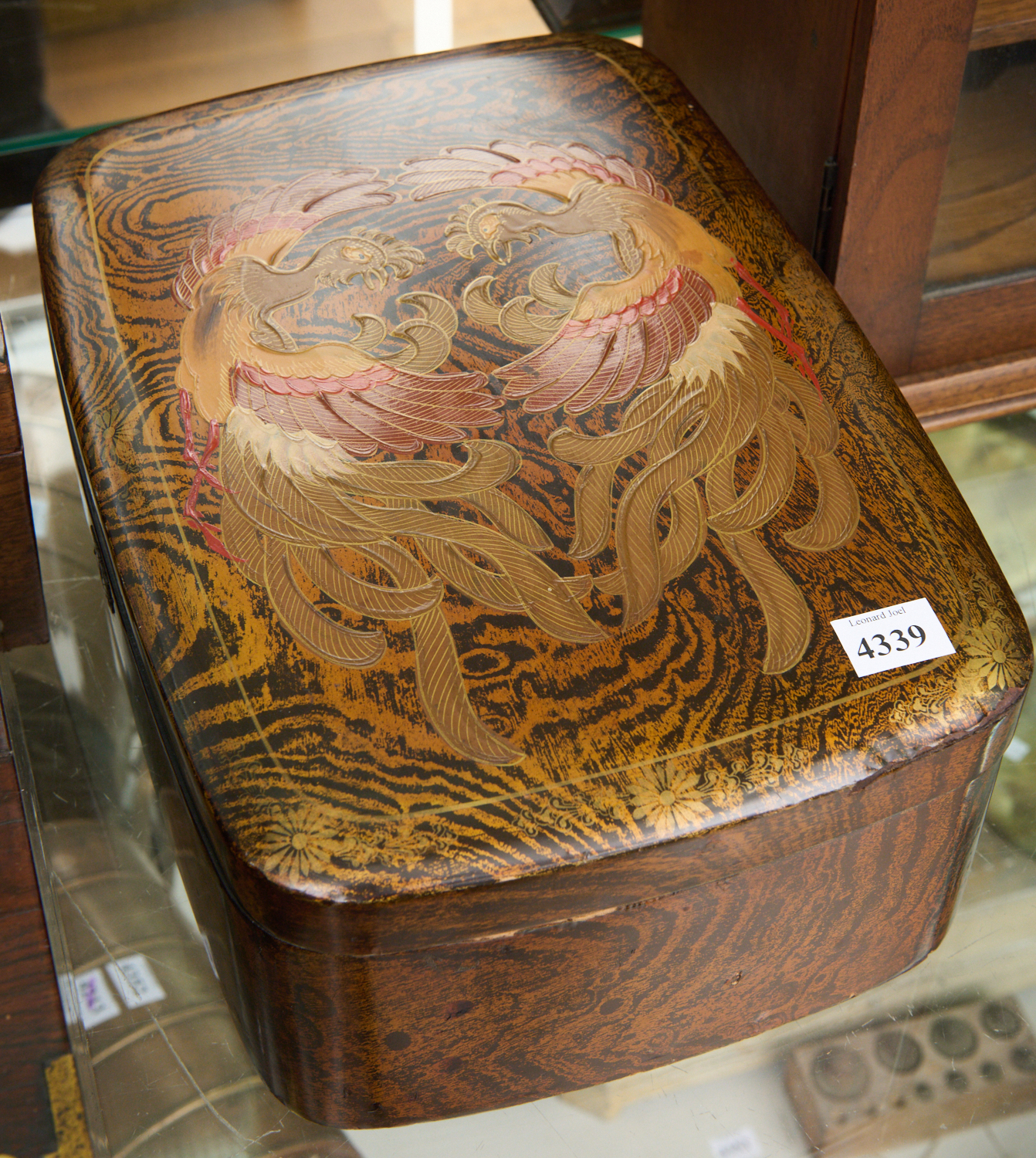 A 19TH CENTURY CHINESE LACQUERED BOX WITH RAISED GILT PHOENIX DECORATION (31 CM W), LEONARD JOEL LOCAL DELIVERY SIZE: SMALL