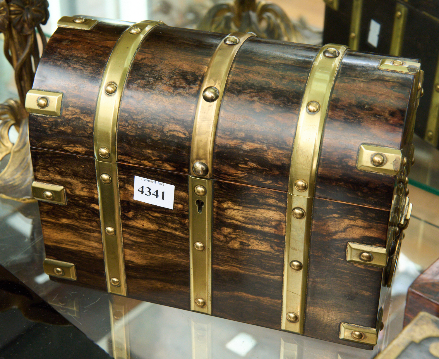 A VICTORIAN COROMANDEL BRASS AND WOOD DECORATED STATIONARY BOX, SIGNED BY HALSTAFF & HANAFORD (22 CM W), LEONARD JOEL LOCAL DELIVERY SIZE: SMALL