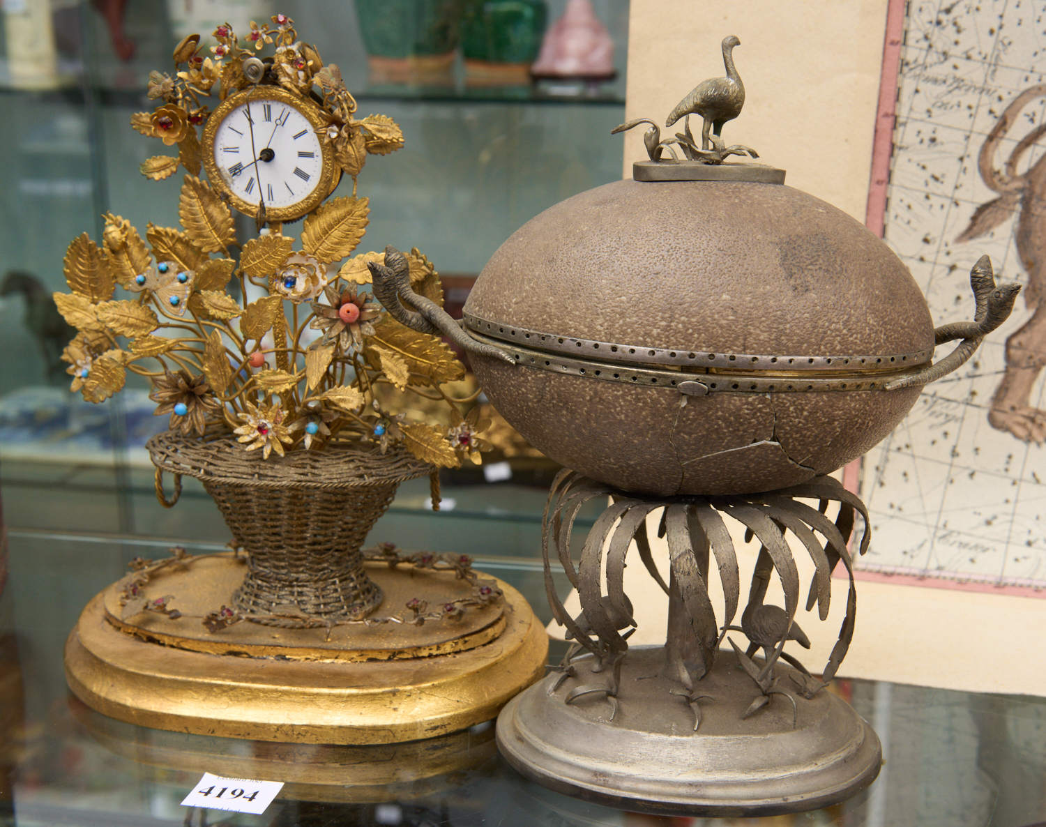 A VICTORIAN CONTINENTAL TABLE CLOCK WITH SEMI PRECIOUS STONE DECORATION TOGETHER WITH VICTORIAN SILVER PLATED EMU EGG CASKET (A/F), LEONARD JOEL LOCAL DELIVERY SIZE: SMALL