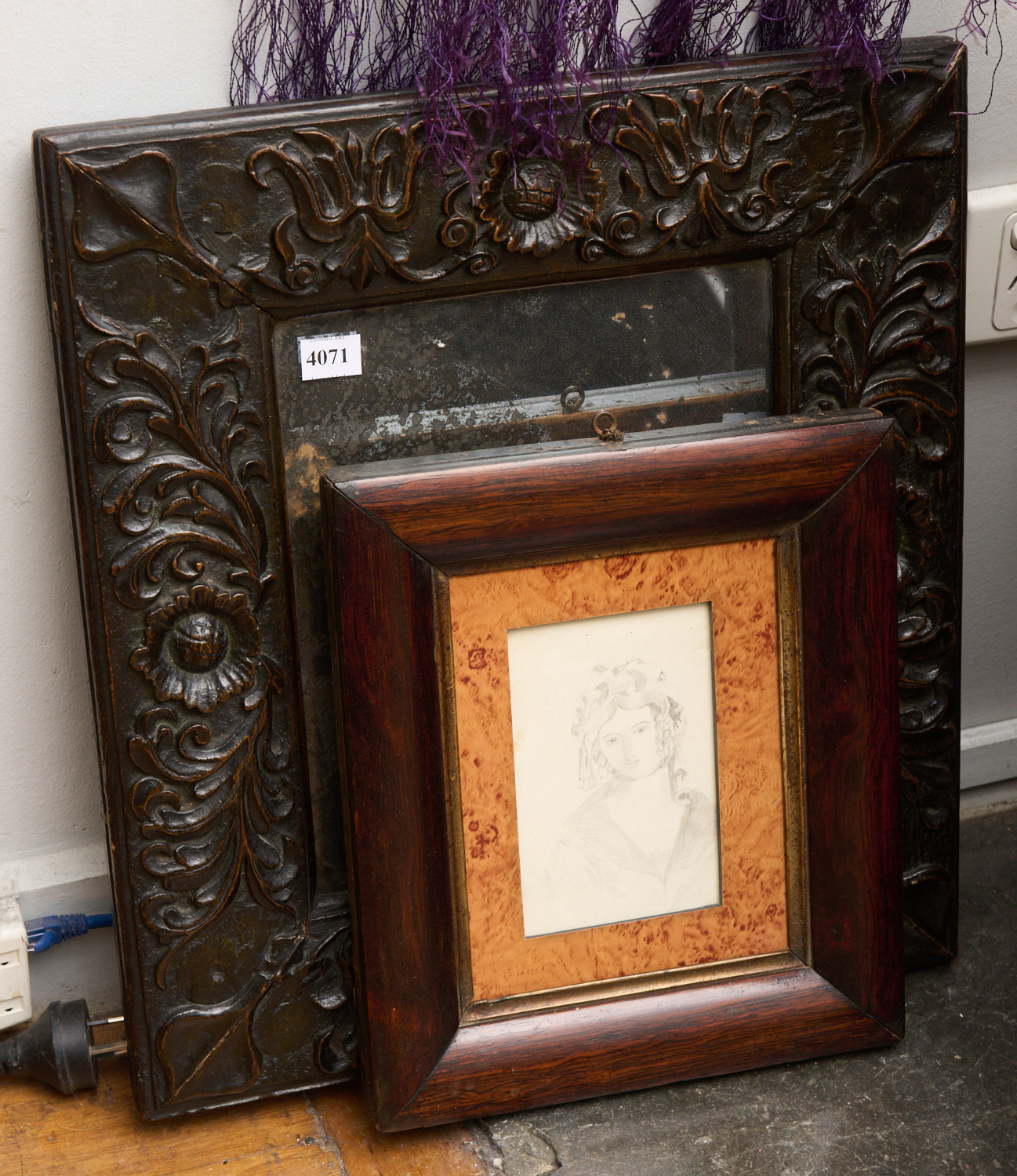 A FRAMED VINTAGE MIRROR TOGETHER WITH FRAMED PENCIL DRAWING, LEONARD JOEL LOCAL DELIVERY SIZE: SMALL