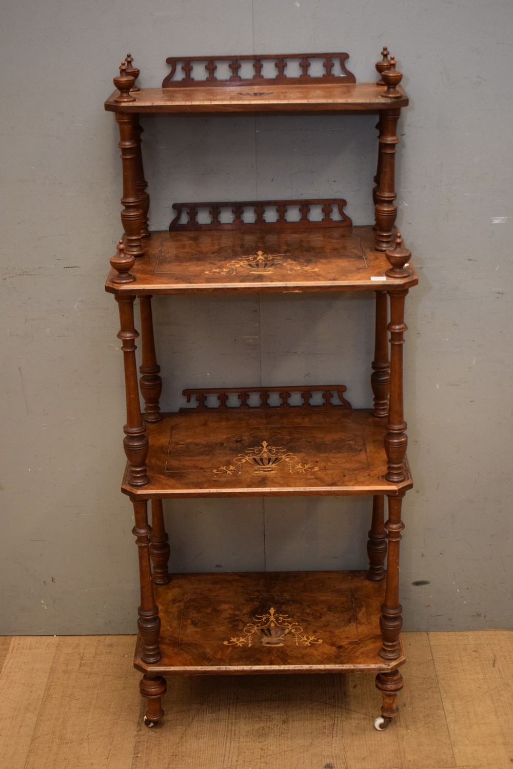 A VICTORIAN FOUR TIER TIMBER INLAID WHATNOT (A/F) (132H x 55W x 36D CM) (LEONARD JOEL DELIVERY SIZE: LARGE)