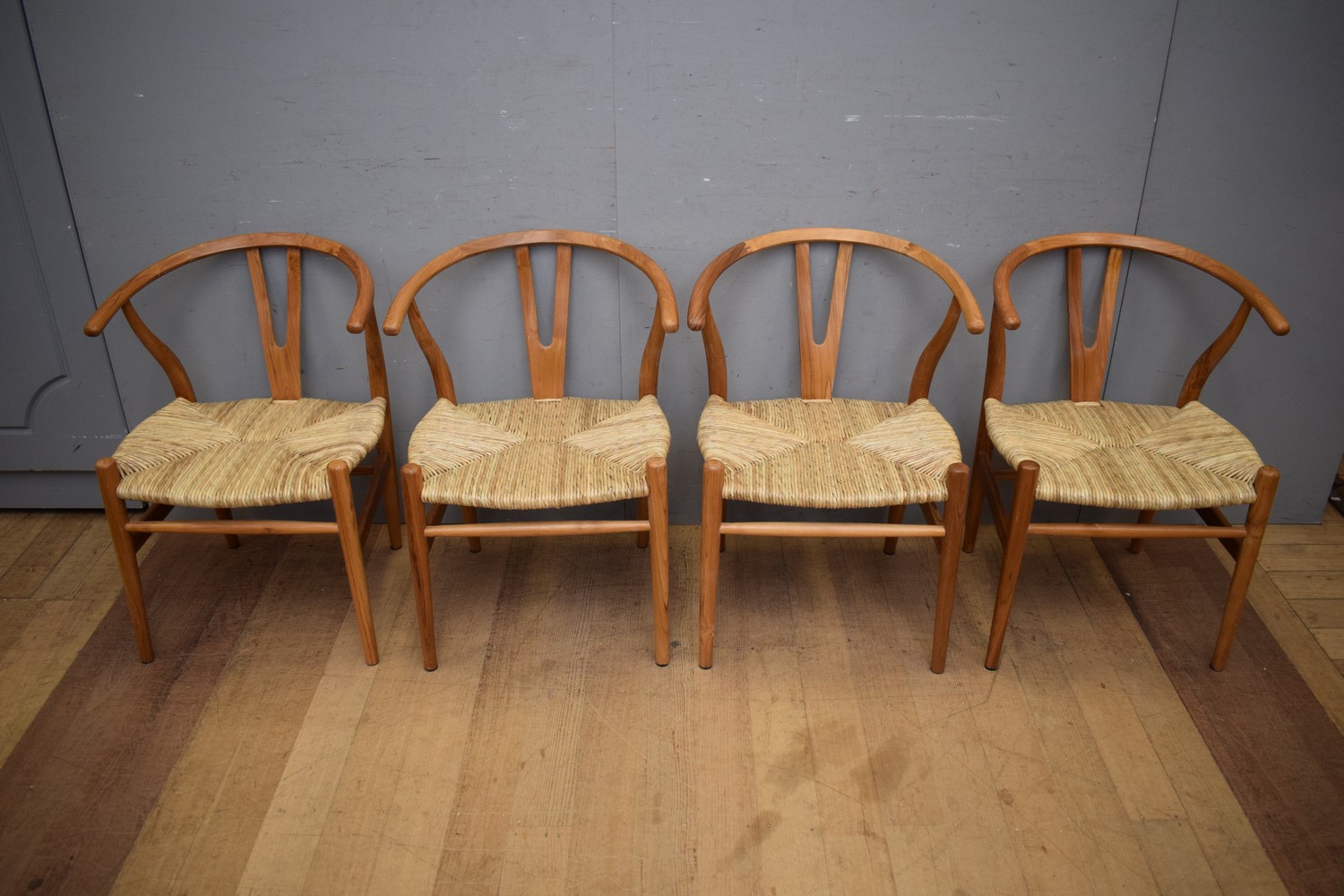 FOUR WISHBONE STYLE CHAIRS WITH GENUINE RUSH SEATS ( 75 H X 55W X 55D CM) (LEONARD JOEL DELIVERY SIZE: LARGE)