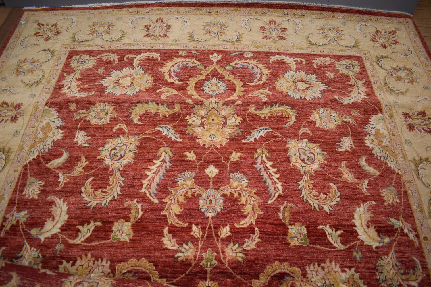 A WILLIAM MORRIS STYLE RUG, VEGETABLE NATURAL DYE, NATURAL WOOL, ALL HAND WOVEN, MADE IN AGRA, HEAVY DUTY (372 X 273 CM) (PLEASE NOTE THIS HEAVY ITEM MUST BE REMOVED BY CARRIERS AT THE CUSTOMER'S EXPENSE. LEONARD JOEL STAFF CANNOT ASSIST CARRYING THIS ITEM) (X-LARGE ITEM)