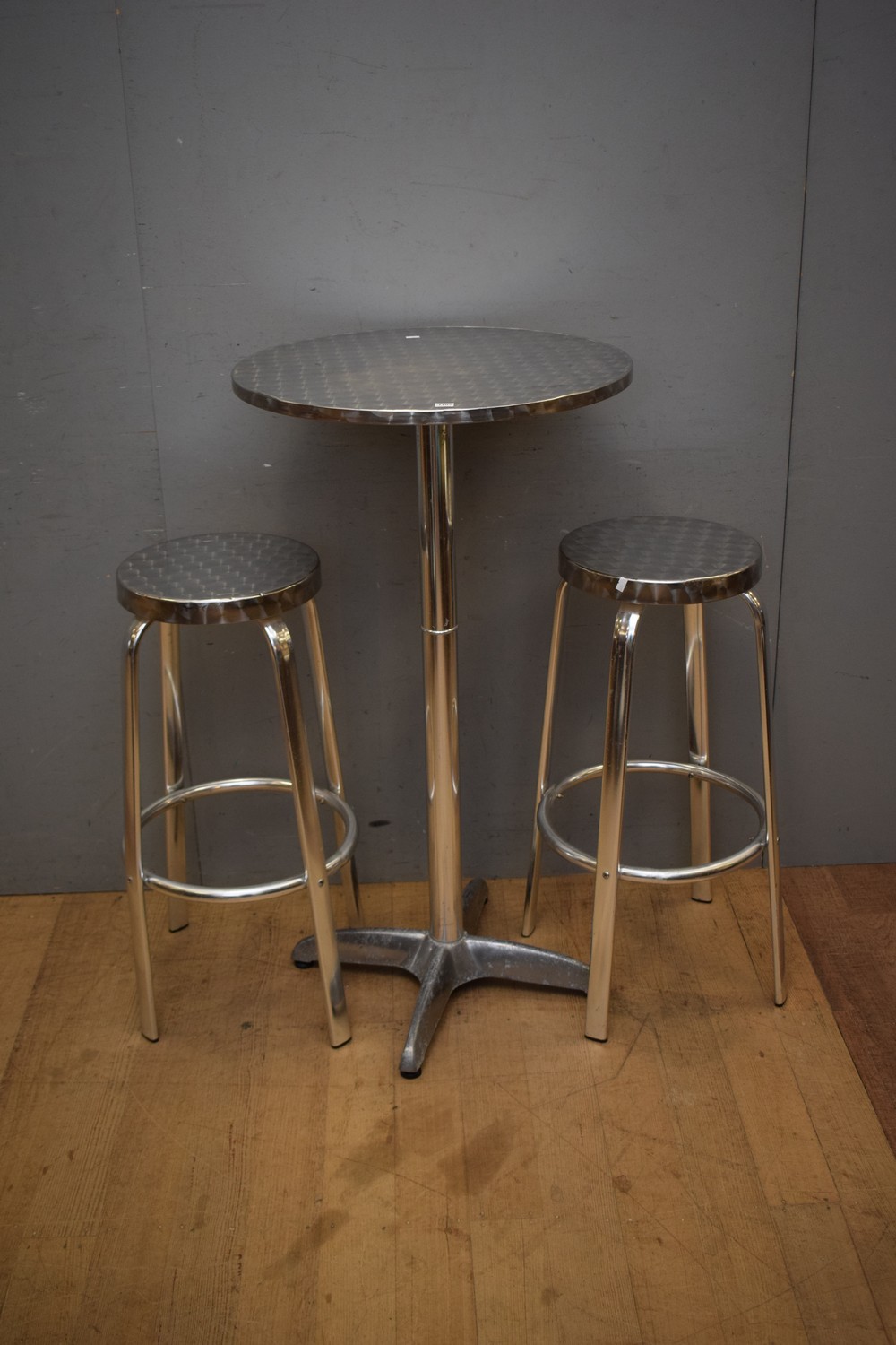 A CONTEMPORARY CHROME THREE PIECE OUTDOOR BAR SETTING (A/F) (TABLE 110H x 67D CM) (LEONARD JOEL DELIVERY SIZE: LARGE)