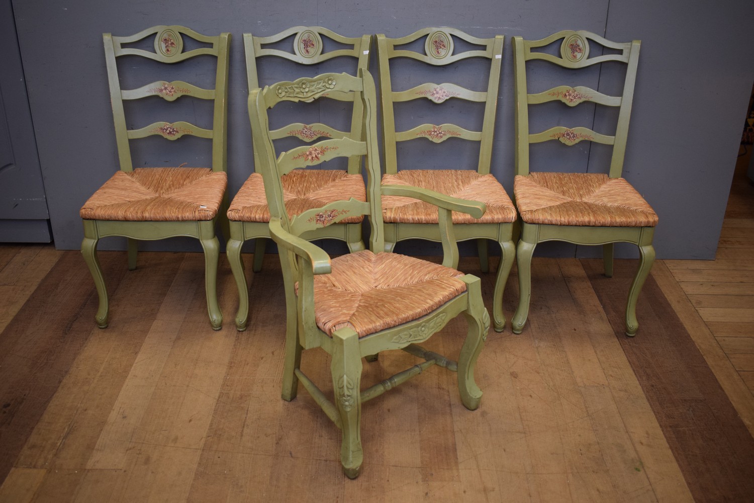 A SET OF FIVE FRENCH STYLE PAINTED DINING CHAIRS WITH RUSH SEATING (98H x 48W x 50D CM) (LEONARD JOEL DELIVERY SIZE: LARGE)