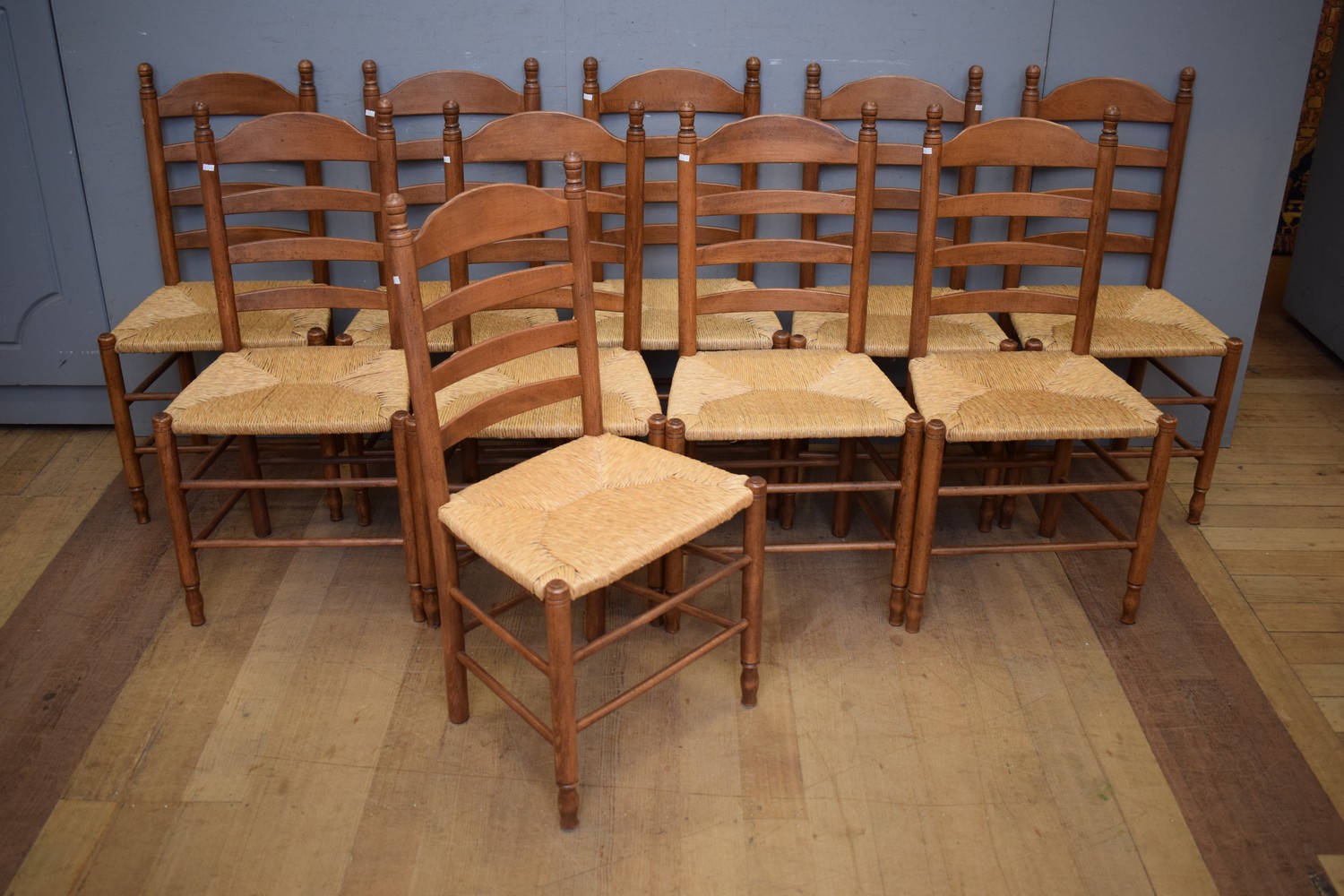 A SET OF TEN LADDERBACK DINING CHAIRS WITH RUSH SEATING ( 99H X 51W X 46D CM)(PLEASE NOTE THIS HEAVY ITEM MUST BE REMOVED BY CARRIERS AT THE CUSTOMER'S EXPENSE. LEONARD JOEL STAFF CANNOT ASSIST CARRYING THIS ITEM) (X-LARGE ITEM)