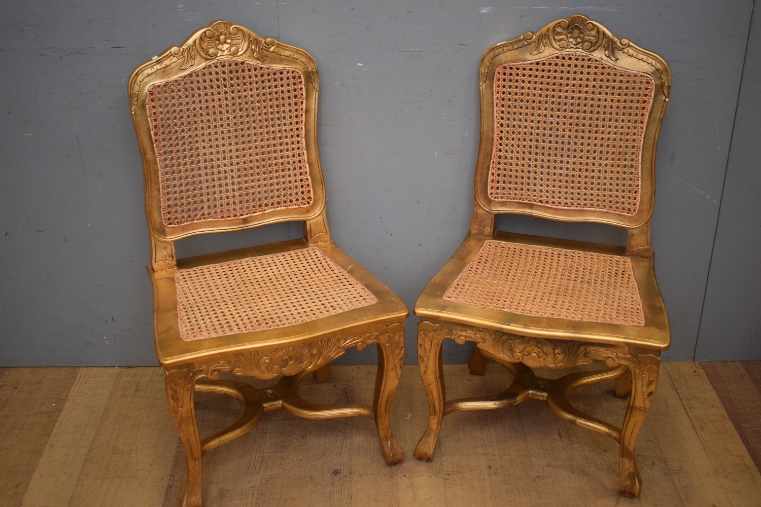 A PAIR OF GILT EFFECT RATTAN DINING CHAIRS ( 98H X 54W X 43D CM) (LEONARD JOEL DELIVERY SIZE: LARGE)