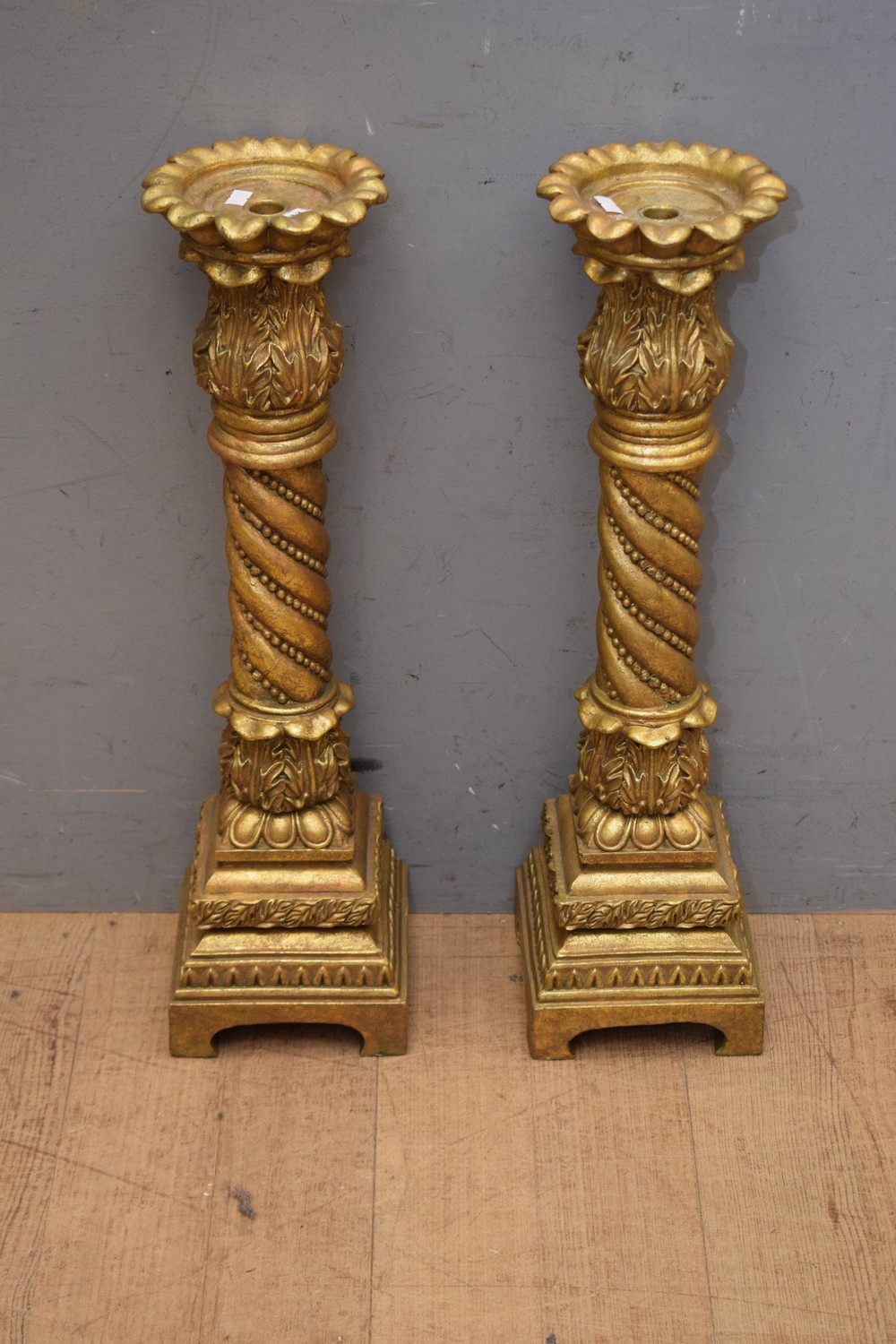 A PAIR OF HIGHLY DECORATIVE GILT EFFECT CANDELABRAS (63H CM) (LEONARD JOEL DELIVERY SIZE: MEDIUM)