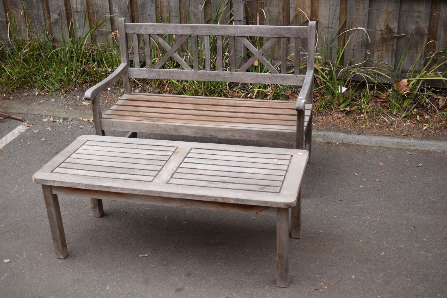 A TEAK OUTDOOR BENCH AND COFFEE TABLE ( BENCH 86H X 112W X 56D CM) (LEONARD JOEL DELIVERY SIZE: LARGE)