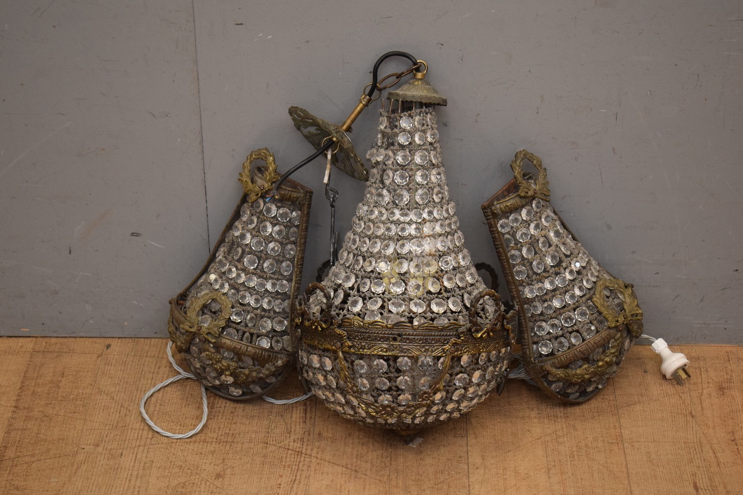 A BASKET CHANDELIER AND MATCHING PAIR OF SCONCES (A/F) ( 58H X 30 DIAMETER CM) (LEONARD JOEL DELIVERY SIZE: MEDIUM)