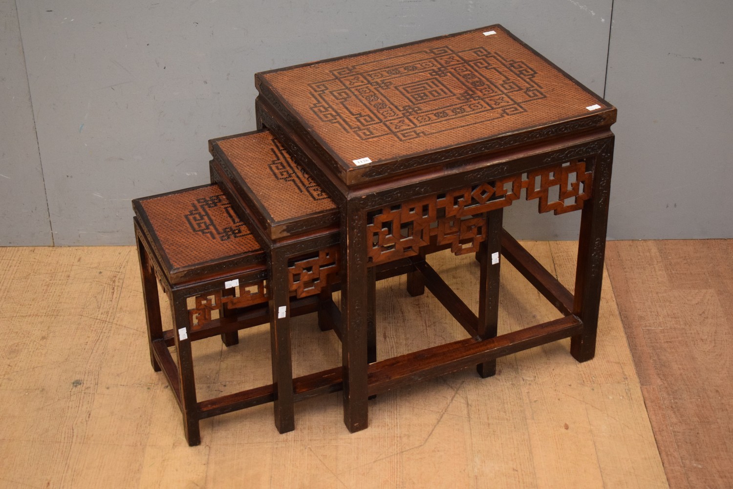 A NEST OF THREE DECORATIVELY CARVED SIDE TABLES (51H x 48W x 38D CM) (LEONARD JOEL DELIVERY SIZE: MEDIUM)