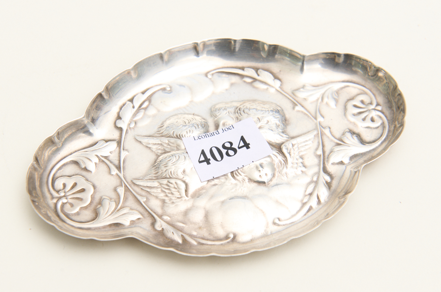 AN EMBOSSED STERLING SILVER TRAY WITH CHERUB MOTIF W.12.5CM, 44G, LEONARD JOEL LOCAL DELIVERY SIZE: SMALL