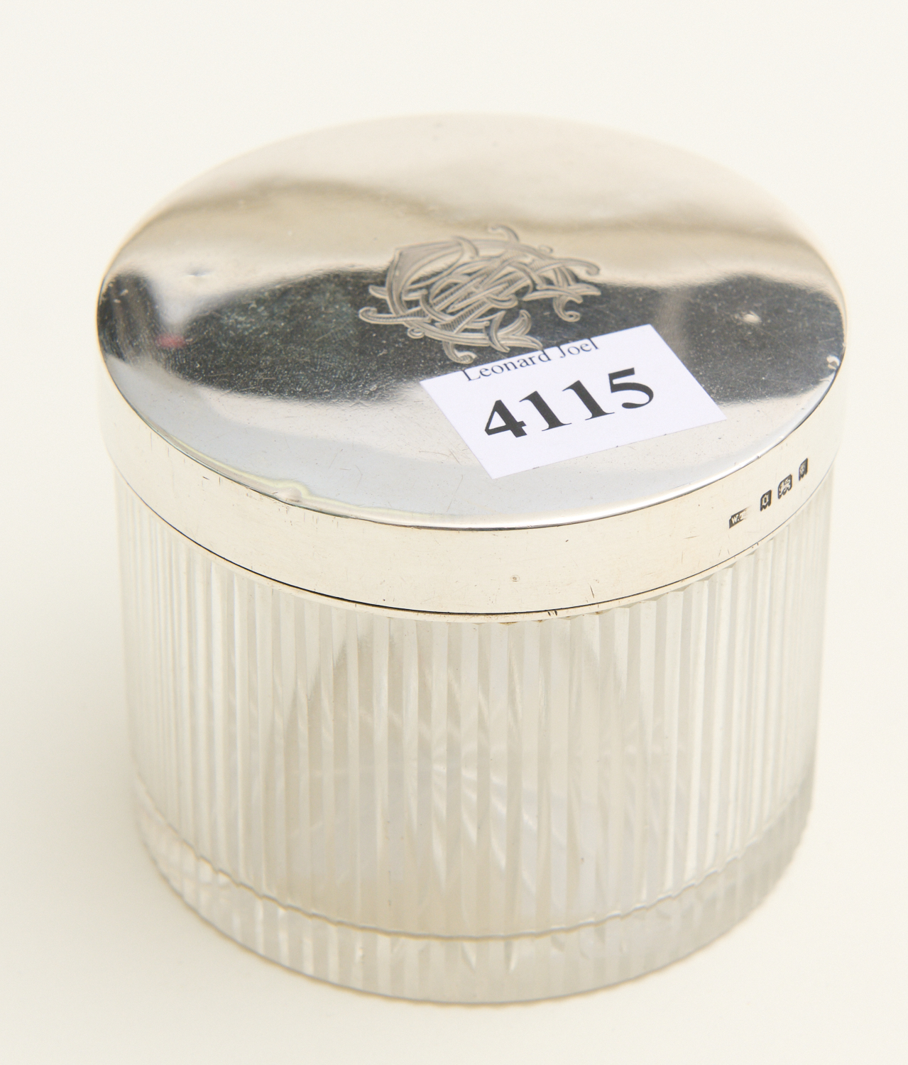 A STERLING SILVER LIDDED GLASS JAR DIA.7.5CM, LEONARD JOEL LOCAL DELIVERY SIZE: SMALL