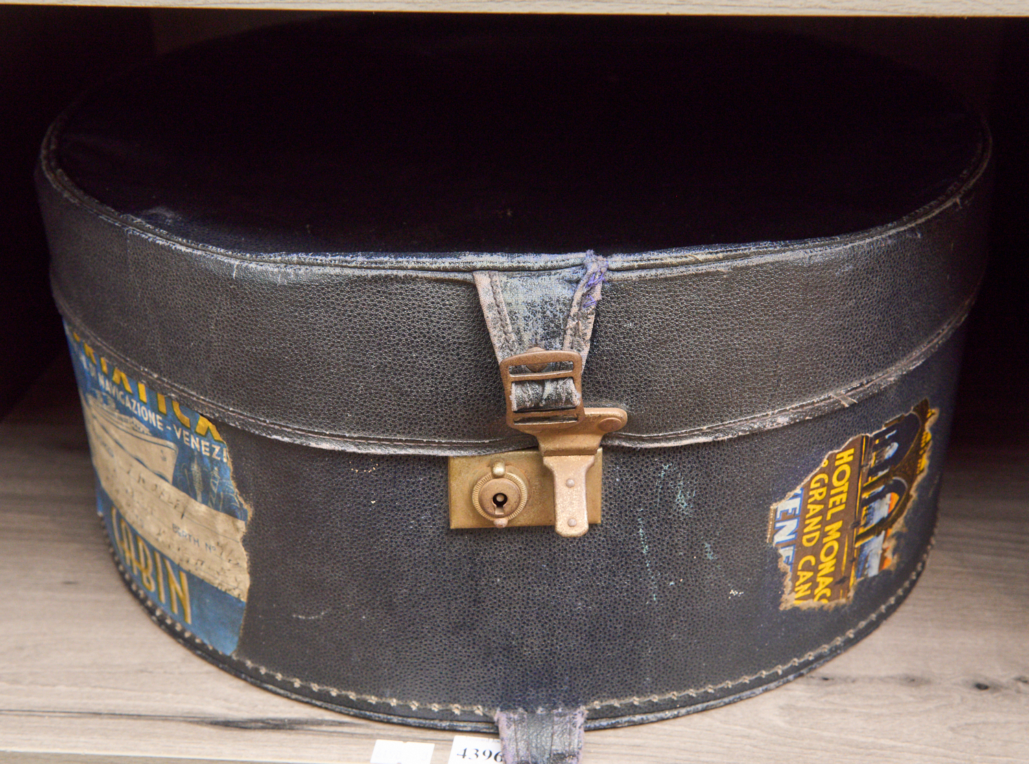 A VINTAGE HAT BOT, NAVY BLUE WITH TRAVEL STICKERS, ALL ORIGINAL FASTENERS WITH ART DECO PRINT LINING AND UNIQUE CARRY HANDLE DIA.39CM, LEONARD JOEL LOCAL DELIVERY SIZE: SMALL