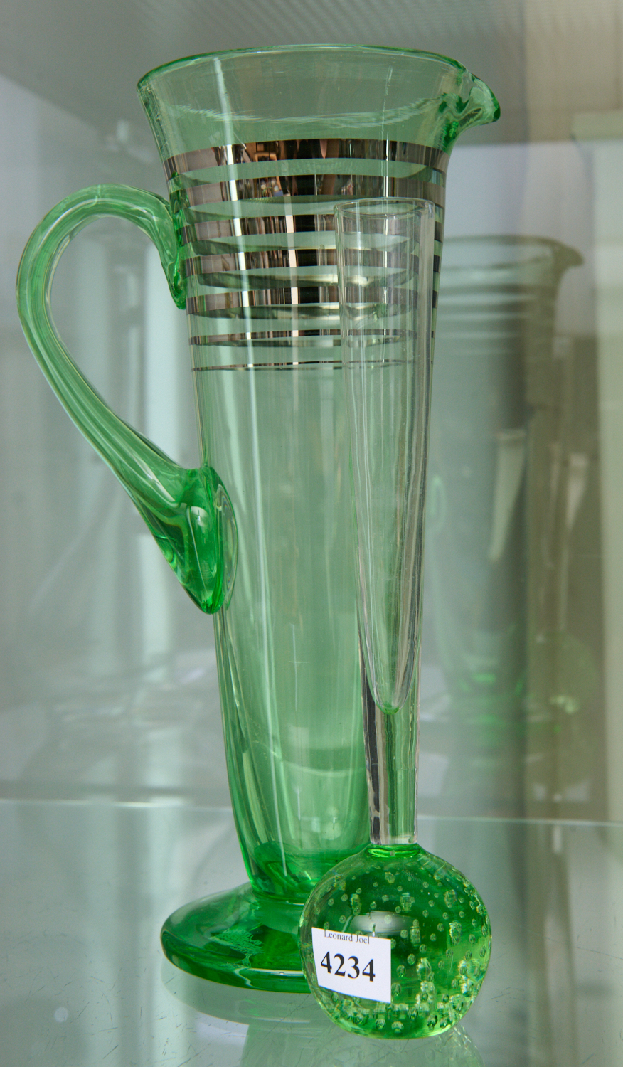 A VINTAGE GREEN GLASS JUG WITH SILVER MOTIFS APPLIED (28 CM H) AND A GREEN SPECIMEN VASE (23 CM H), LEONARD JOEL LOCAL DELIVERY SIZE: SMALL