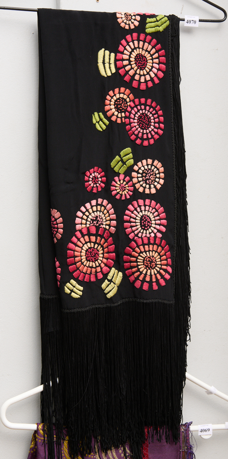 AN ANTIQUE TABLE/PIANO COVER, BLACK WITH FRINGE AND ART DECO EMBROIDERED FLORAL MOTIFS, LEONARD JOEL LOCAL DELIVERY SIZE: SMALL