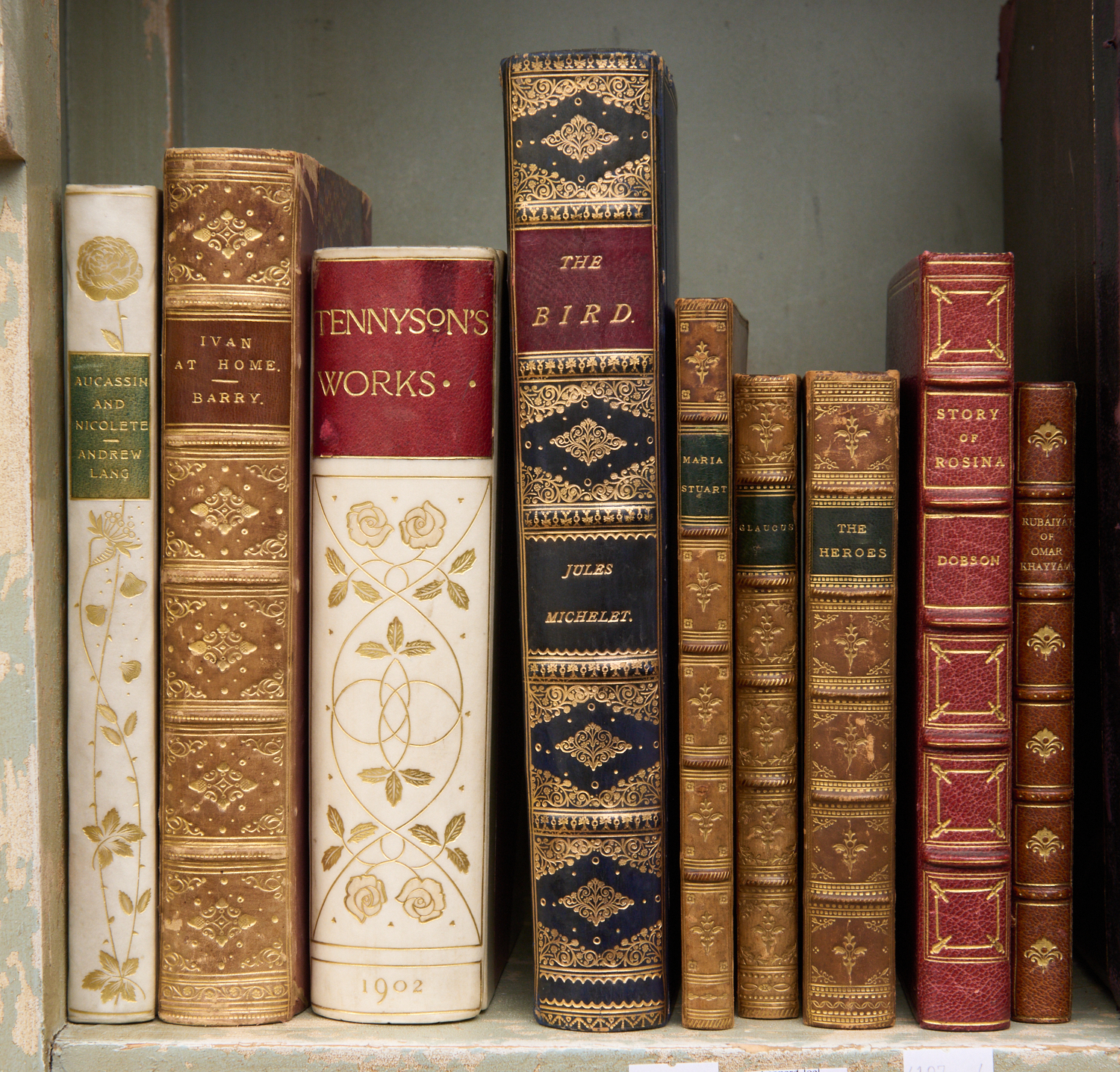 A PART SHELF FINELY BOUND BOOKS INCLUDING RUBAIYAT OF OMAR KHAYYAM, LEONARD JOEL LOCAL DELIVERY SIZE: SMALL