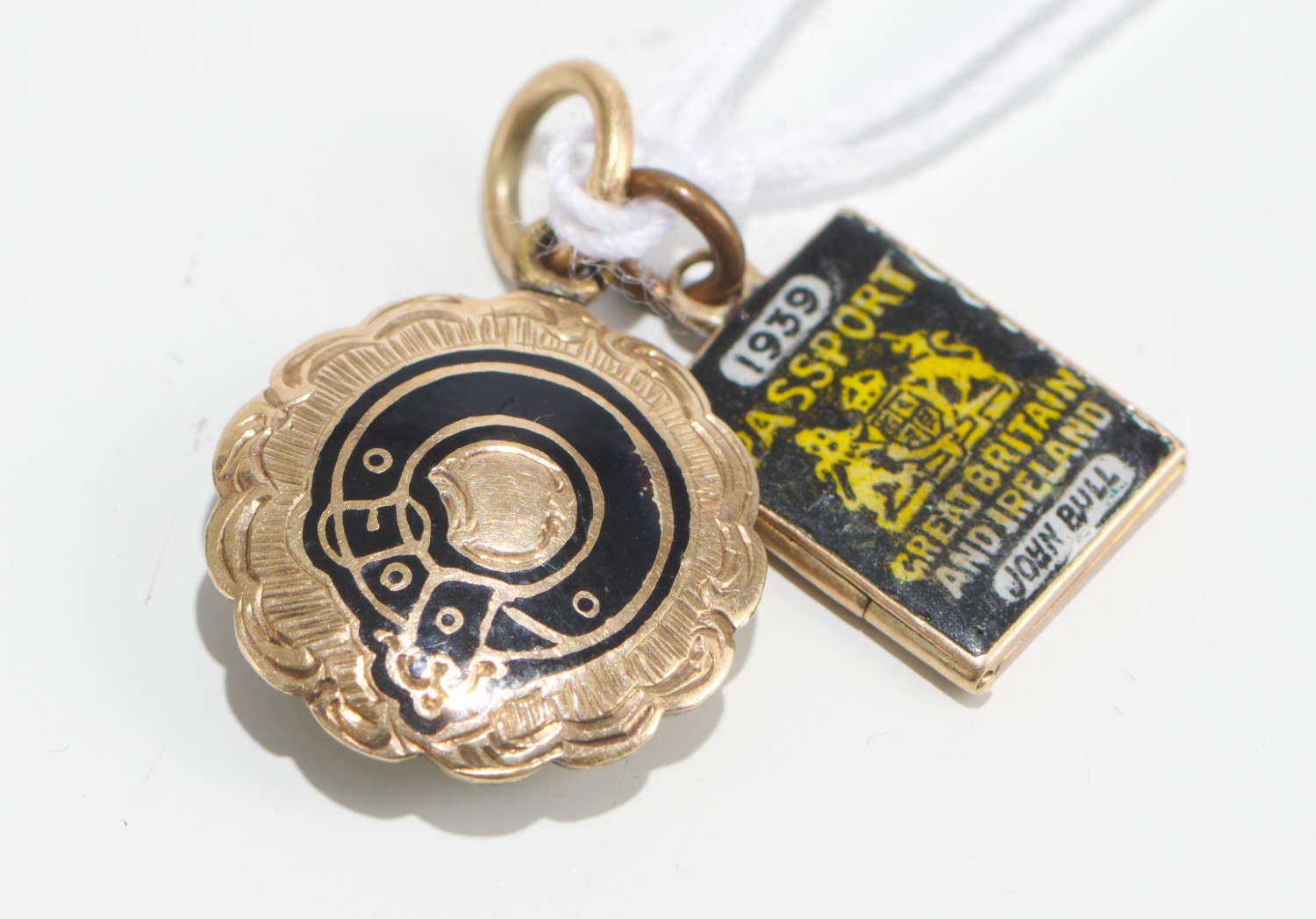 A VICTORIAN BLACK ENAMEL MOURNING LOCKET, GOLD LINED (13MM DIAMETER), TOGETHER WITH AN ENAMEL 1939 PASSPORT CHARM IN 9CT GOLD (11MM X 9MM)