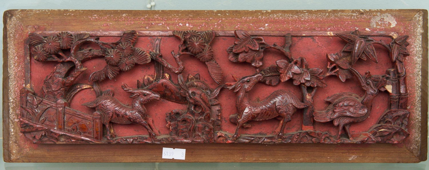 A CHINESE WOOD CARVING IN RED (A/F) (40 CM W), LEONARD JOEL LOCAL DELIVERY SIZE: SMALL