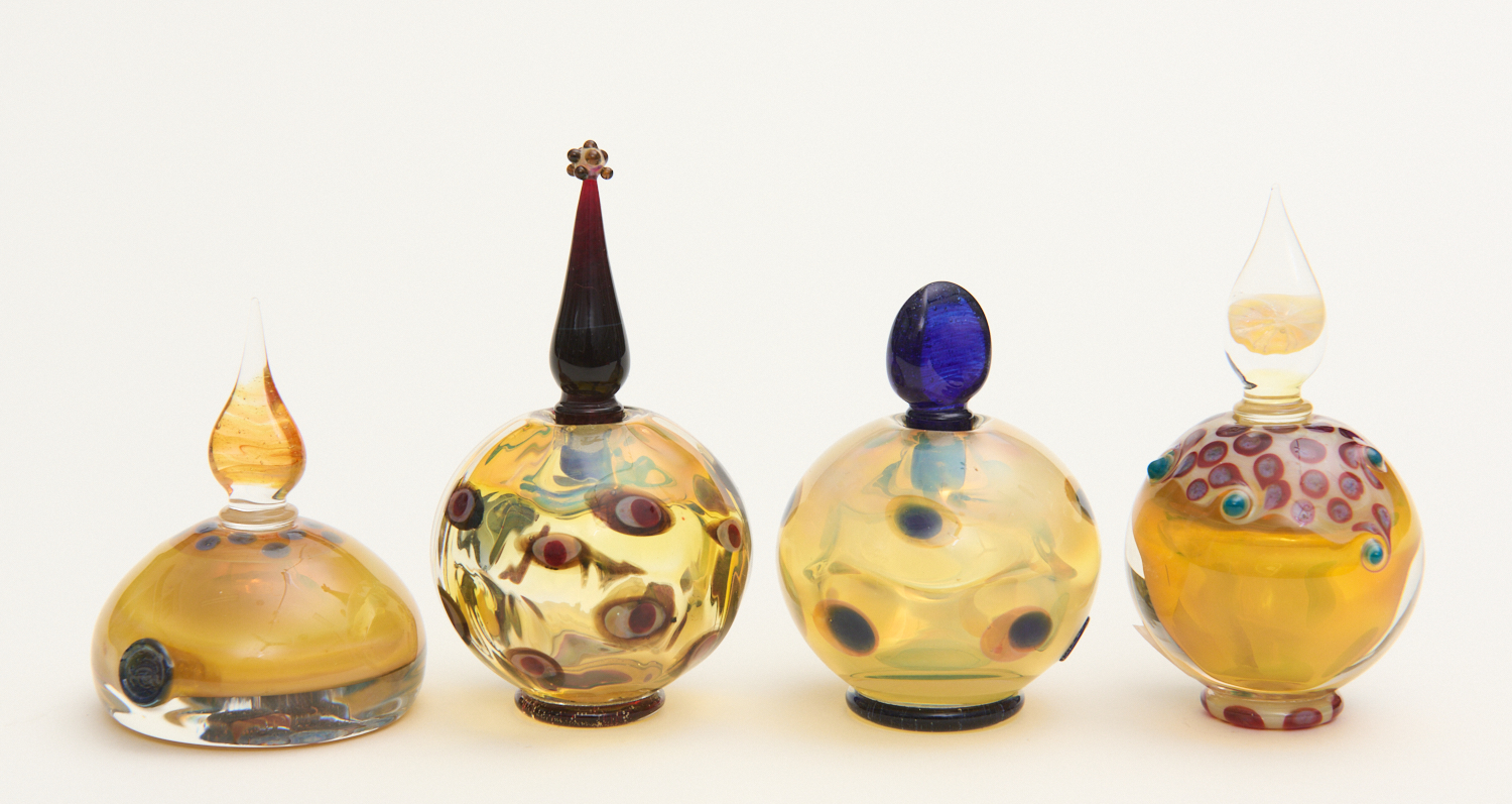 A GROUP OF FOUR JEMMA CLEMENTS ART GLASS PERFUME BOTTLES IN AMBER TONES (TALLEST 9 CM), LEONARD JOEL LOCAL DELIVERY SIZE: SMALL