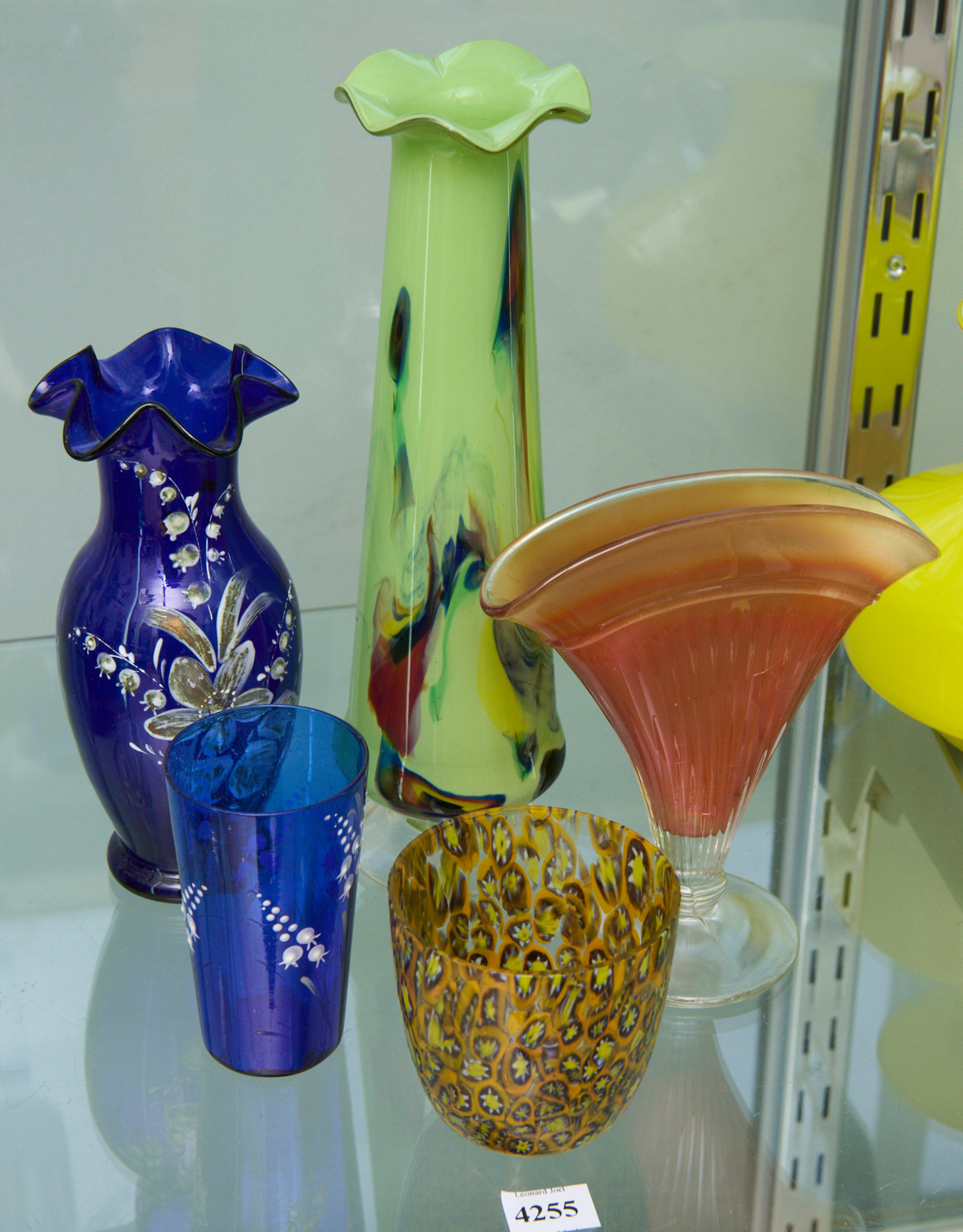 A GROUP OF VINTAGE GLASSWARE INCLUDING MARBLE EFFECT FRILL VASE, LEONARD JOEL LOCAL DELIVERY SIZE: SMALL